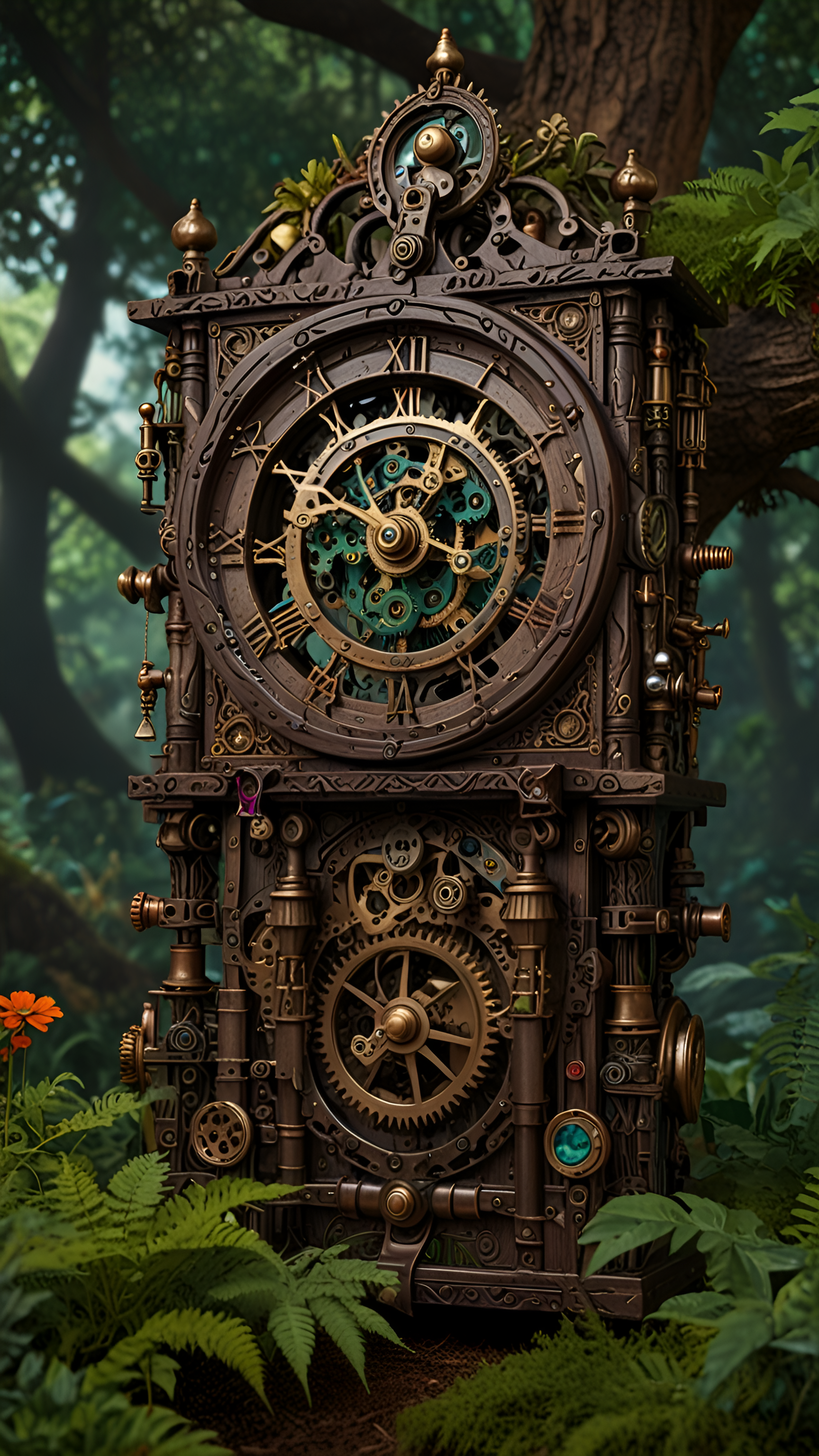 A fantastical steampunk clockwork marvel stands nestled in a lush forest. Its intricate gears and ornate details contrast beautifully with the natural green surroundings, offering a unique and captivating scene.
