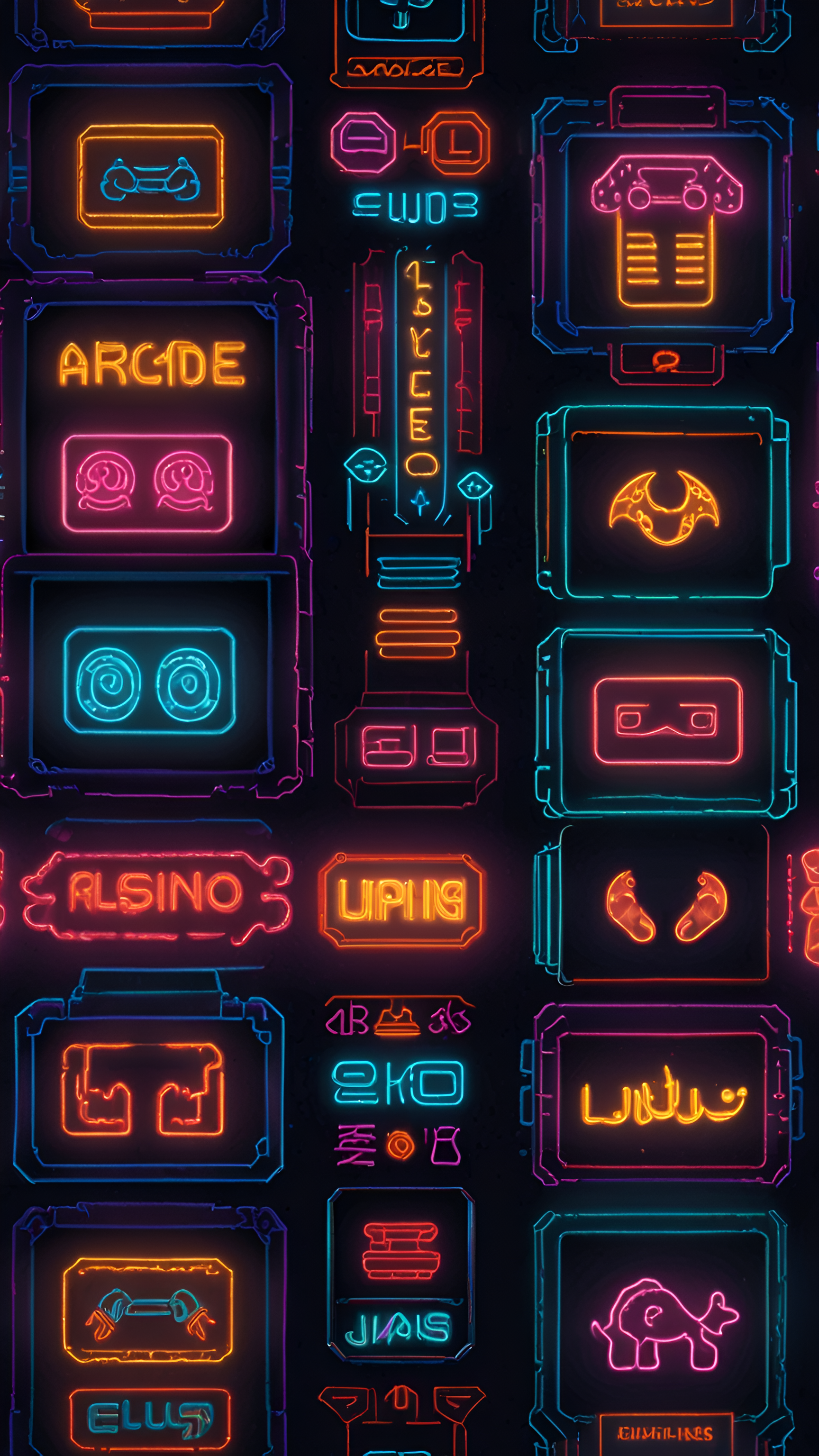 Immerse yourself in a retro-futuristic world with this vibrant neon wallpaper. Featuring glowing arcade-style elements, this image brings a cyberpunk edge to your screen. Great for gaming setups!