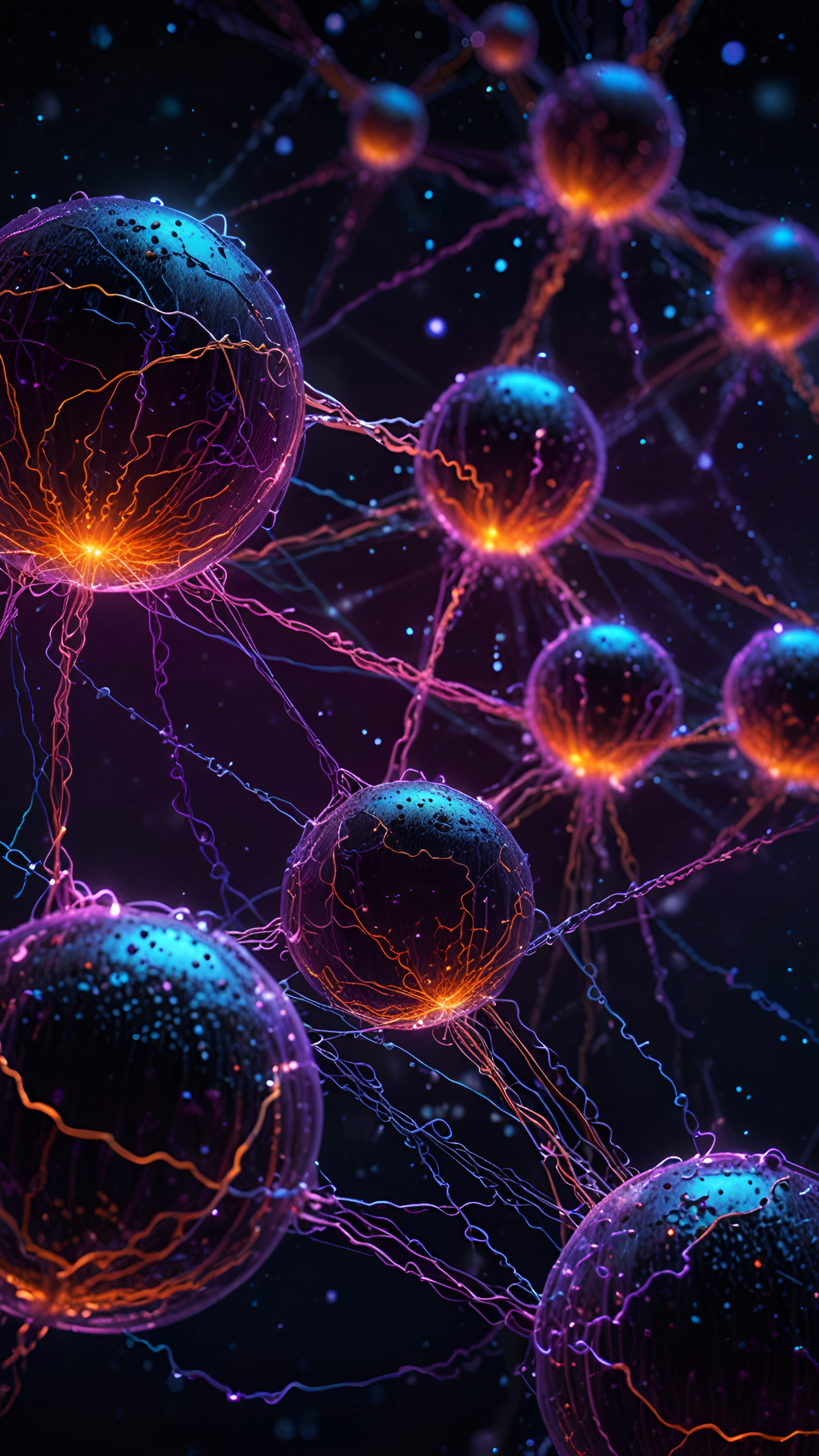 Dive into a vibrant network of interconnected spheres, glowing with orange and blue energy. This mesmerizing wallpaper evokes the complexity and beauty of artificial intelligence.