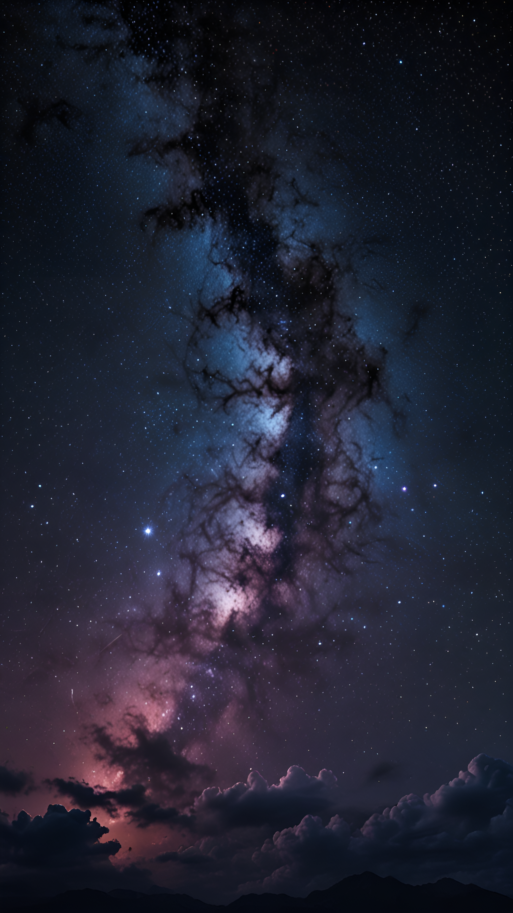 Escape into the cosmos with this breathtaking view of the Milky Way. Pink and blue nebulas intertwine above a landscape of silhouetted mountains and clouds, inviting contemplation and wonder.