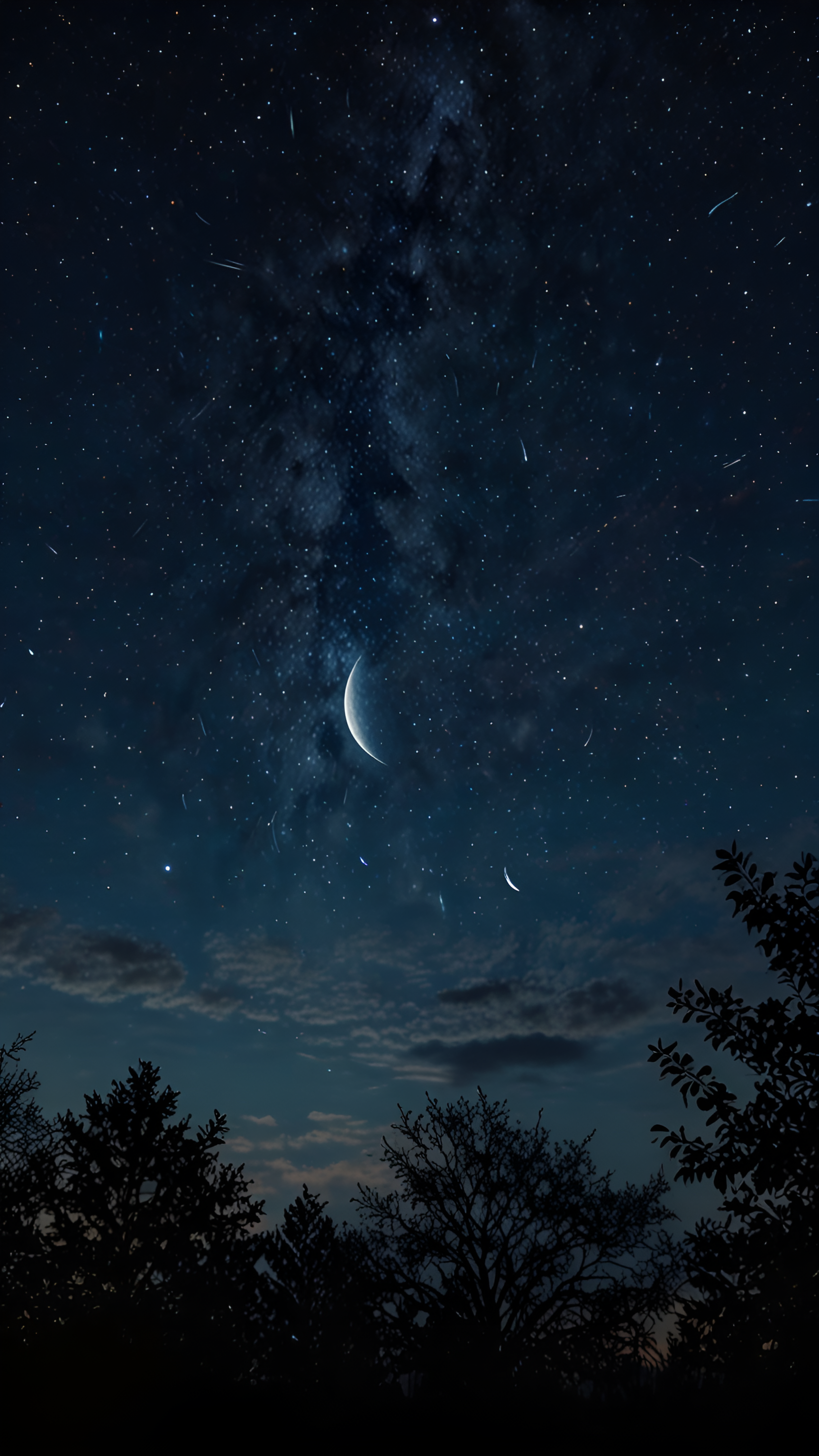 Gaze upon the quiet beauty of the night. A crescent moon hangs in the starry sky above silhouetted trees, creating a peaceful, atmospheric scene. Perfect for adding calm to your digital life.