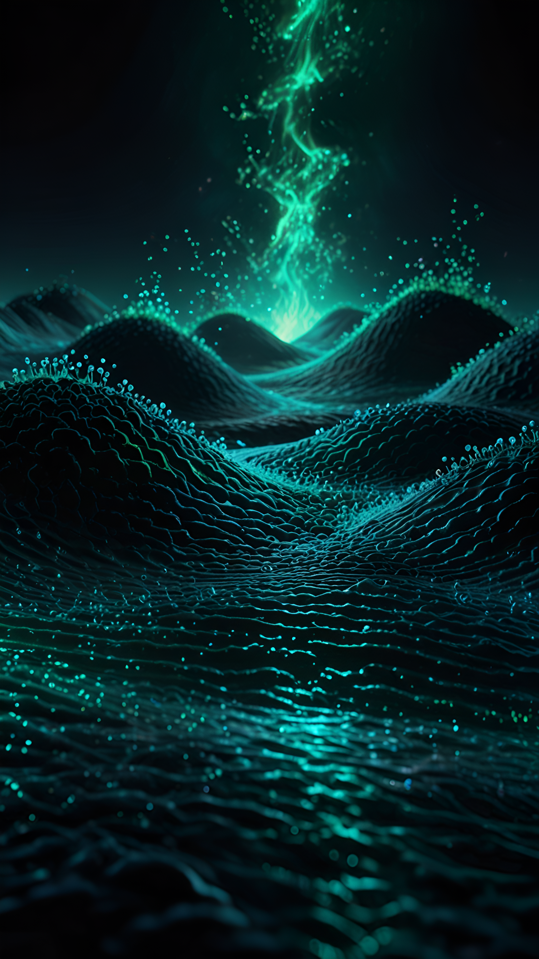 Immerse yourself in this otherworldly landscape. Emerald waves undulate beneath a mystical aurora, creating a mesmerizing and surreal visual experience. Perfect for adding a touch of magic to your screen.