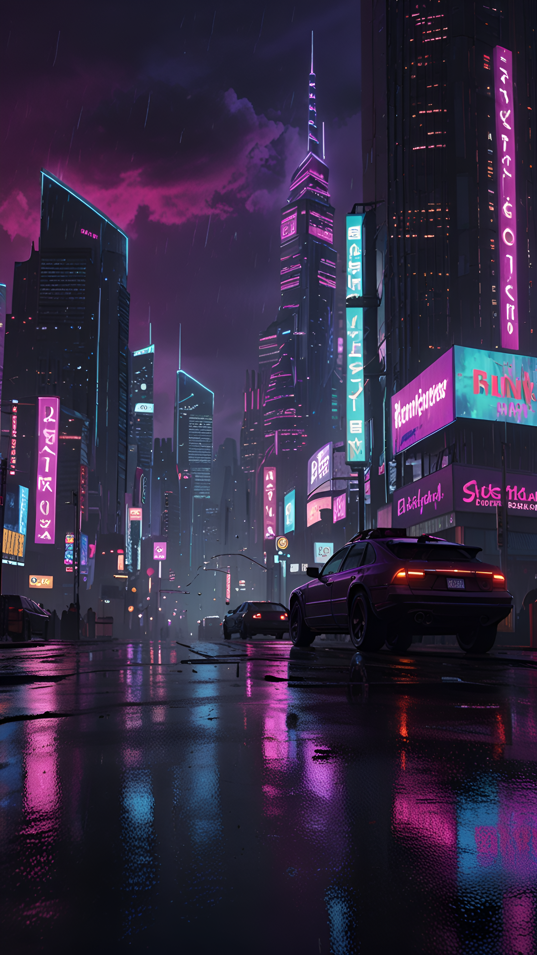 Step into a cyberpunk dream with this vibrant cityscape. Neon signs illuminate the rainy streets, reflecting in the slick asphalt for a dazzling, futuristic feel. Perfect for adding a modern edge to your device.