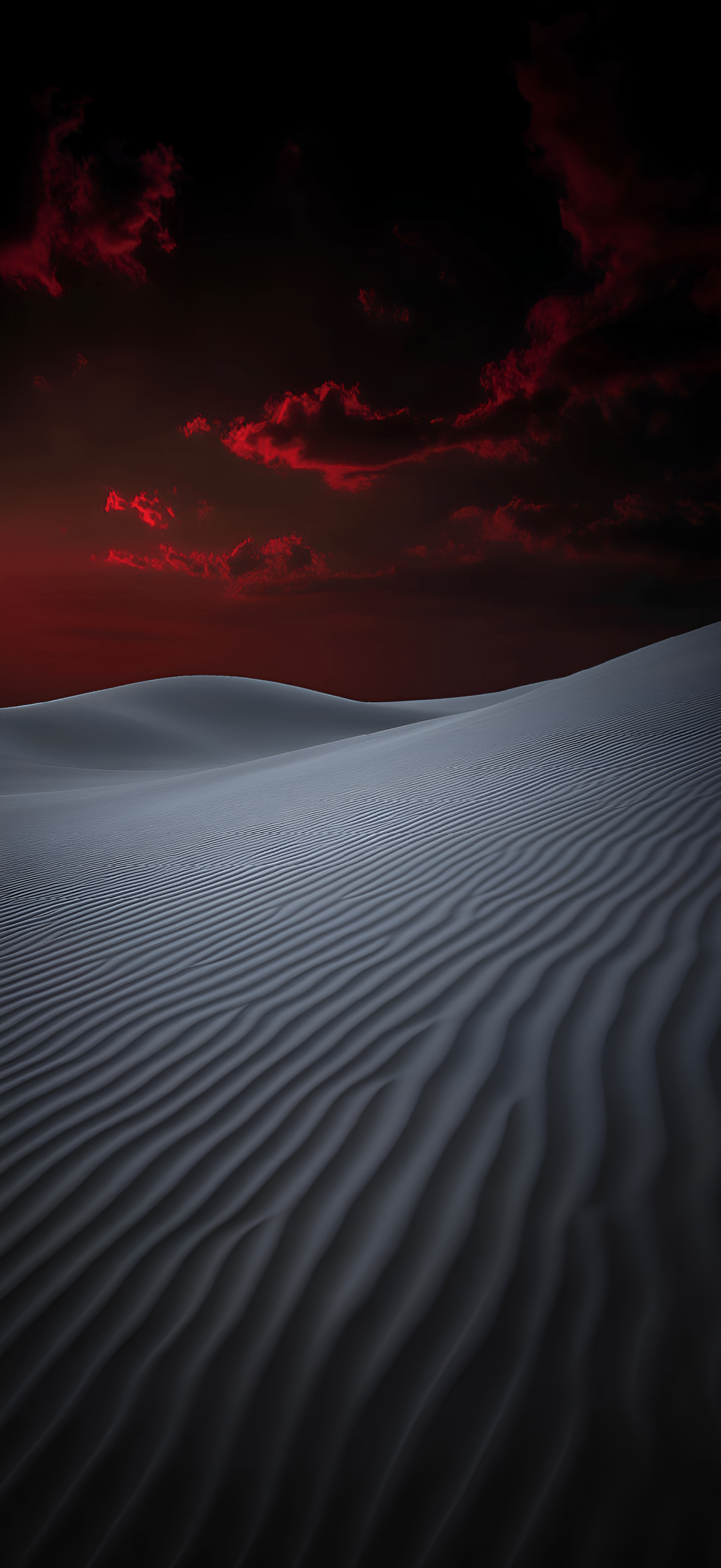 A dramatic landscape featuring white sand dunes under a striking crimson sunset sky. The contrast between the cool dunes and the fiery clouds creates a captivating and surreal scene.