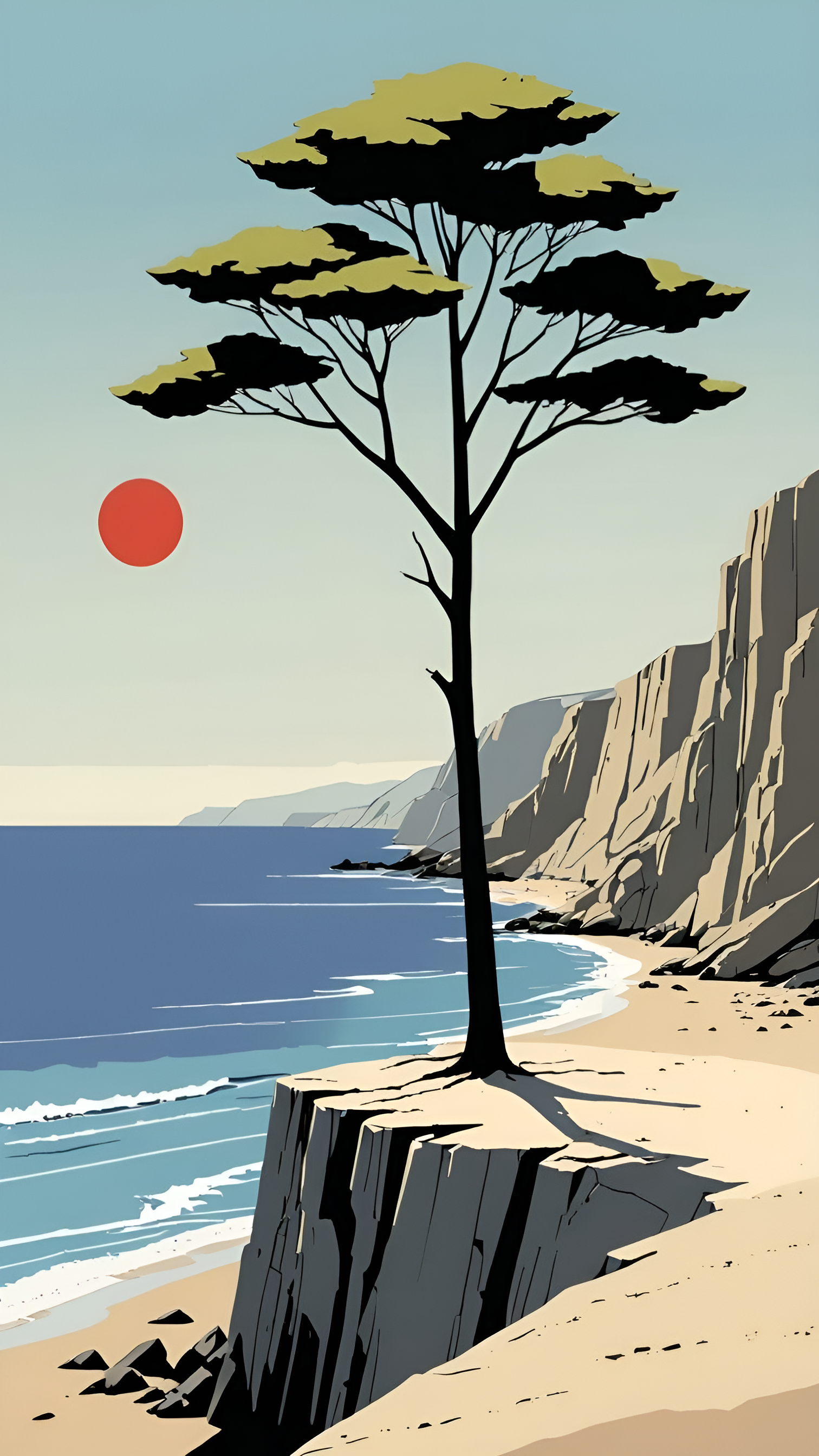 Find serenity with this modern art wallpaper. A lone tree stands on a cliffside overlooking a calm blue sea at sunset. Perfect for adding a touch of tranquility to your device.