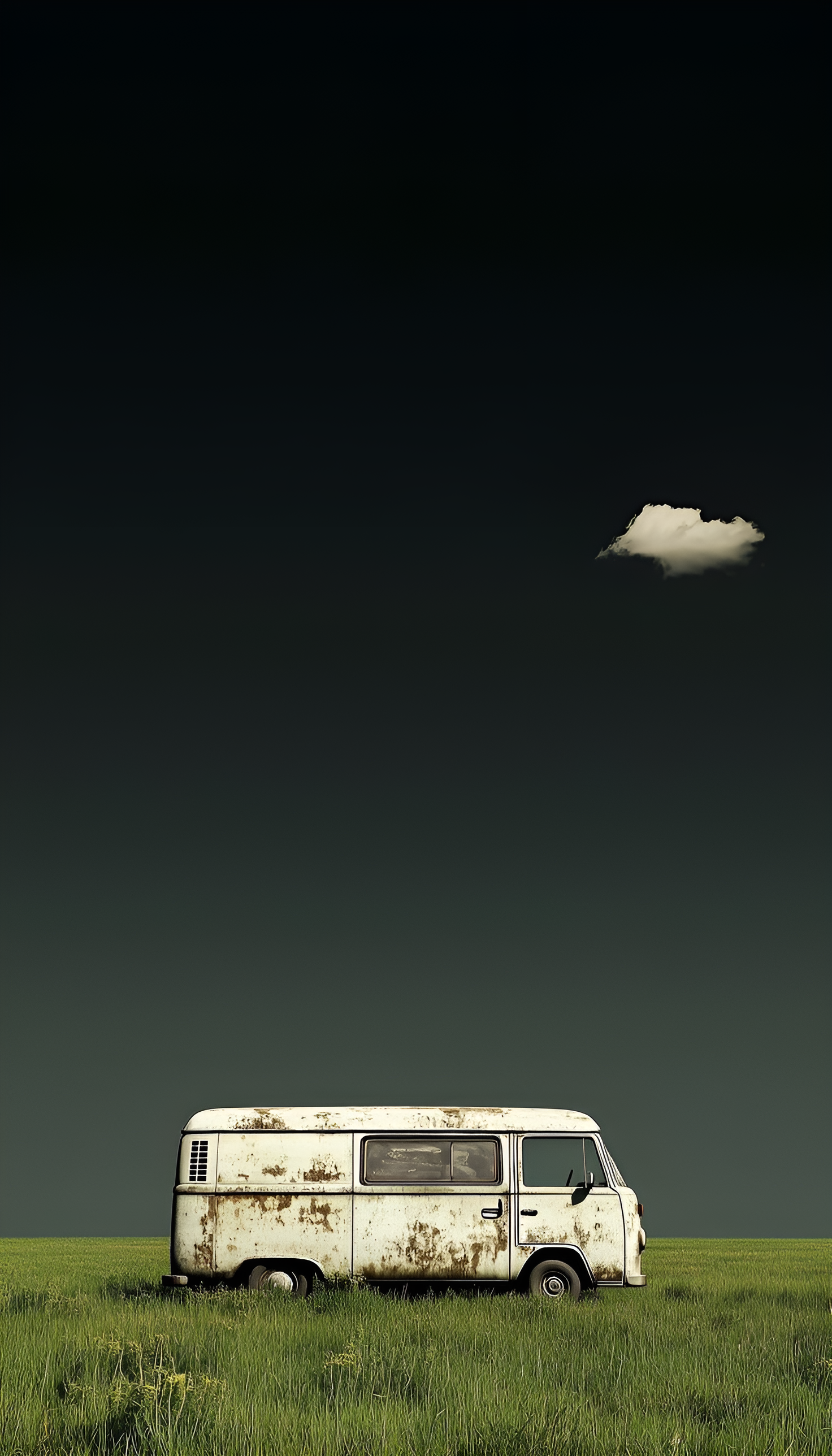 A vintage, weathered van sits in a field under a vast, muted sky. A single cloud punctuates the horizon, evoking a sense of peaceful isolation and quiet contemplation.