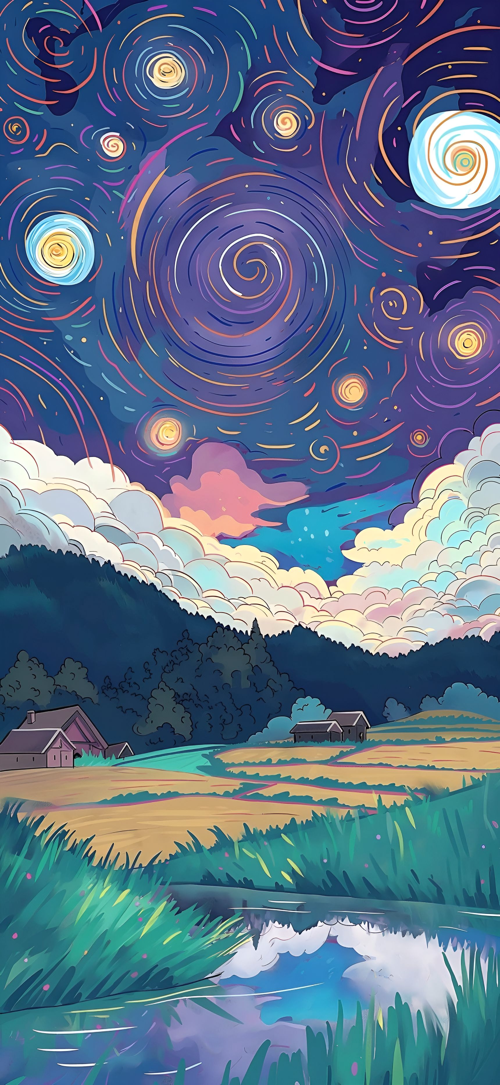 Escape to a serene, whimsical landscape beneath a swirling, colorful night sky. This digital painting features charming cottages, lush fields, and a dreamy, ethereal atmosphere. Perfect for adding a touch of magic to your device.