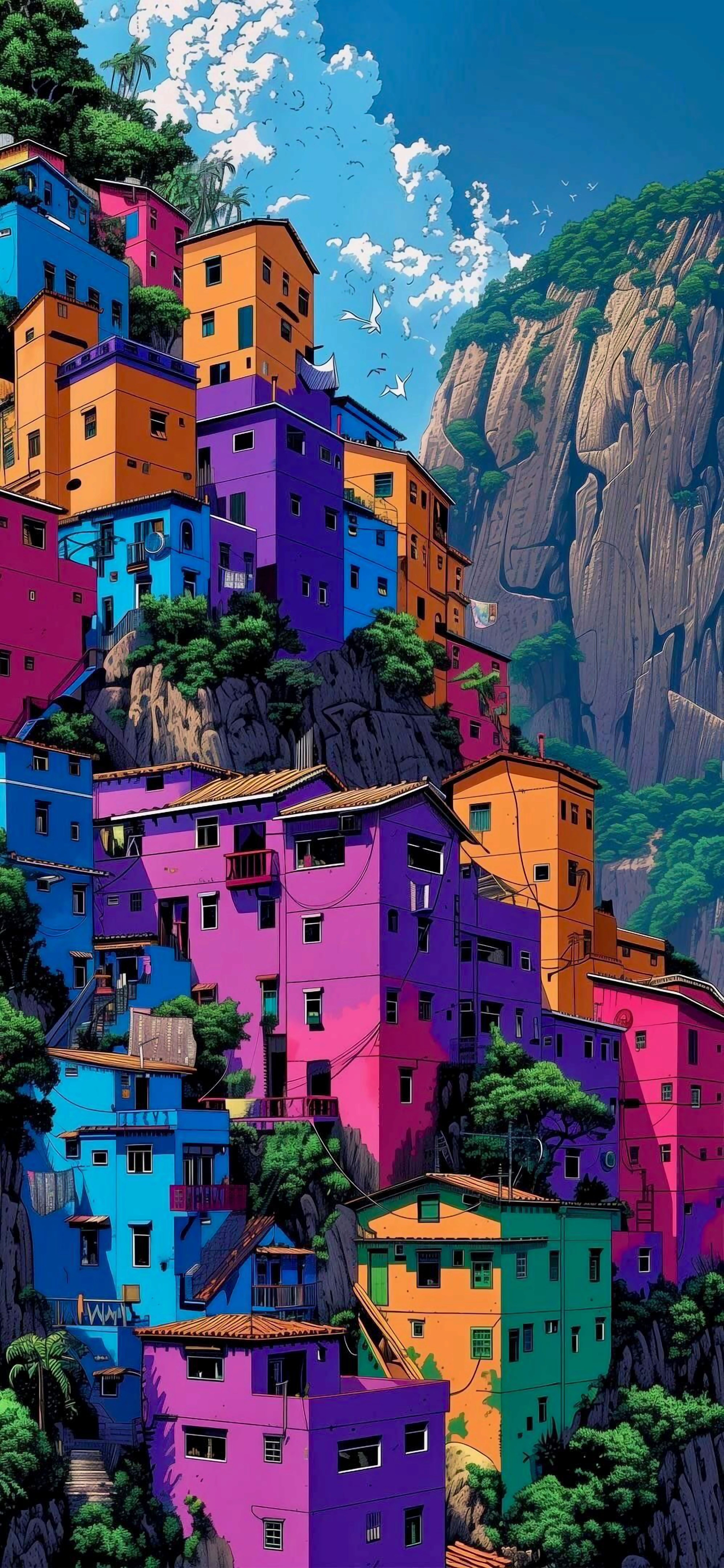Escape to a whimsical village perched on a mountainside, bursting with vibrant colors. The unique architecture and bold hues create a cheerful and inspiring scene.