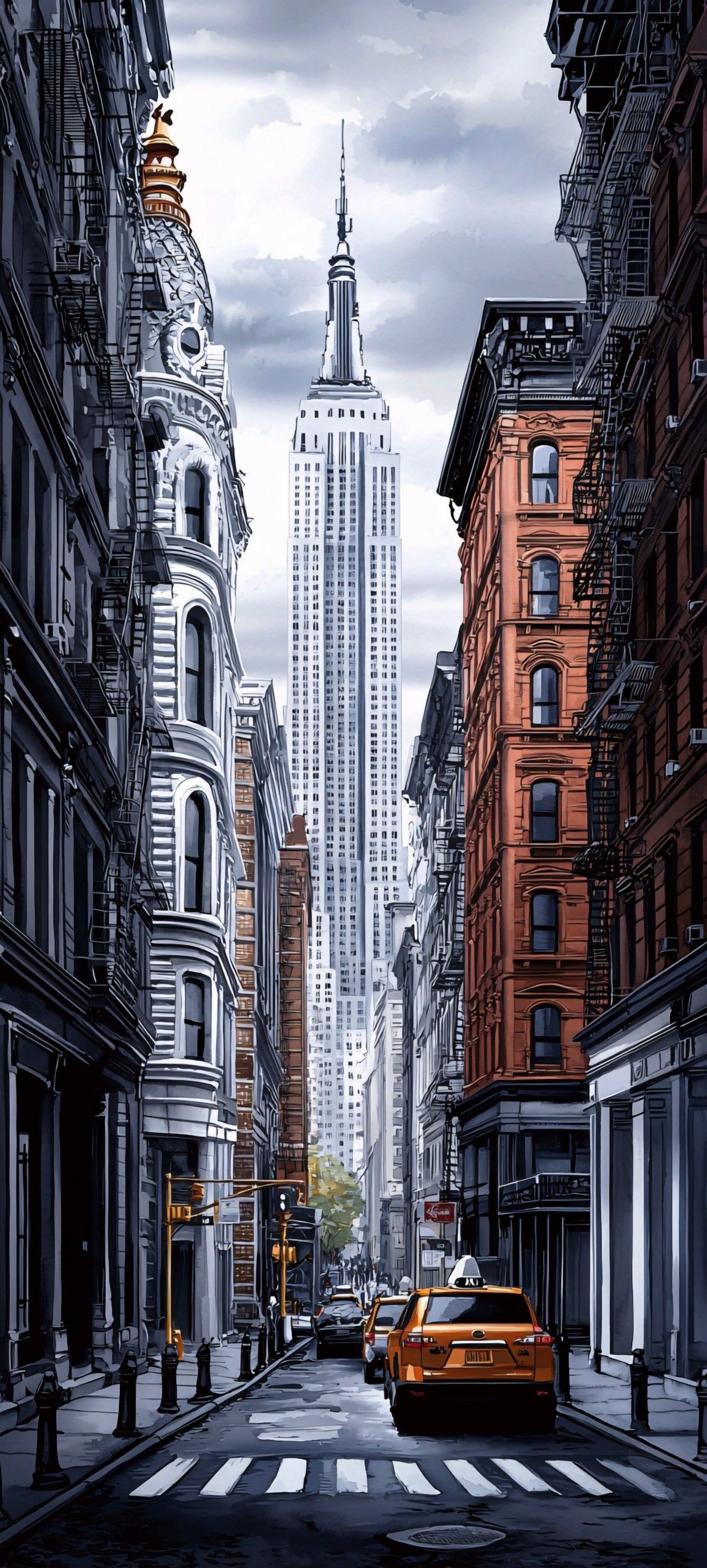 Capture the vibrant energy of New York City with this stunning view. The iconic Empire State Building rises majestically above the bustling streets and yellow cabs. Perfect urban wallpaper.