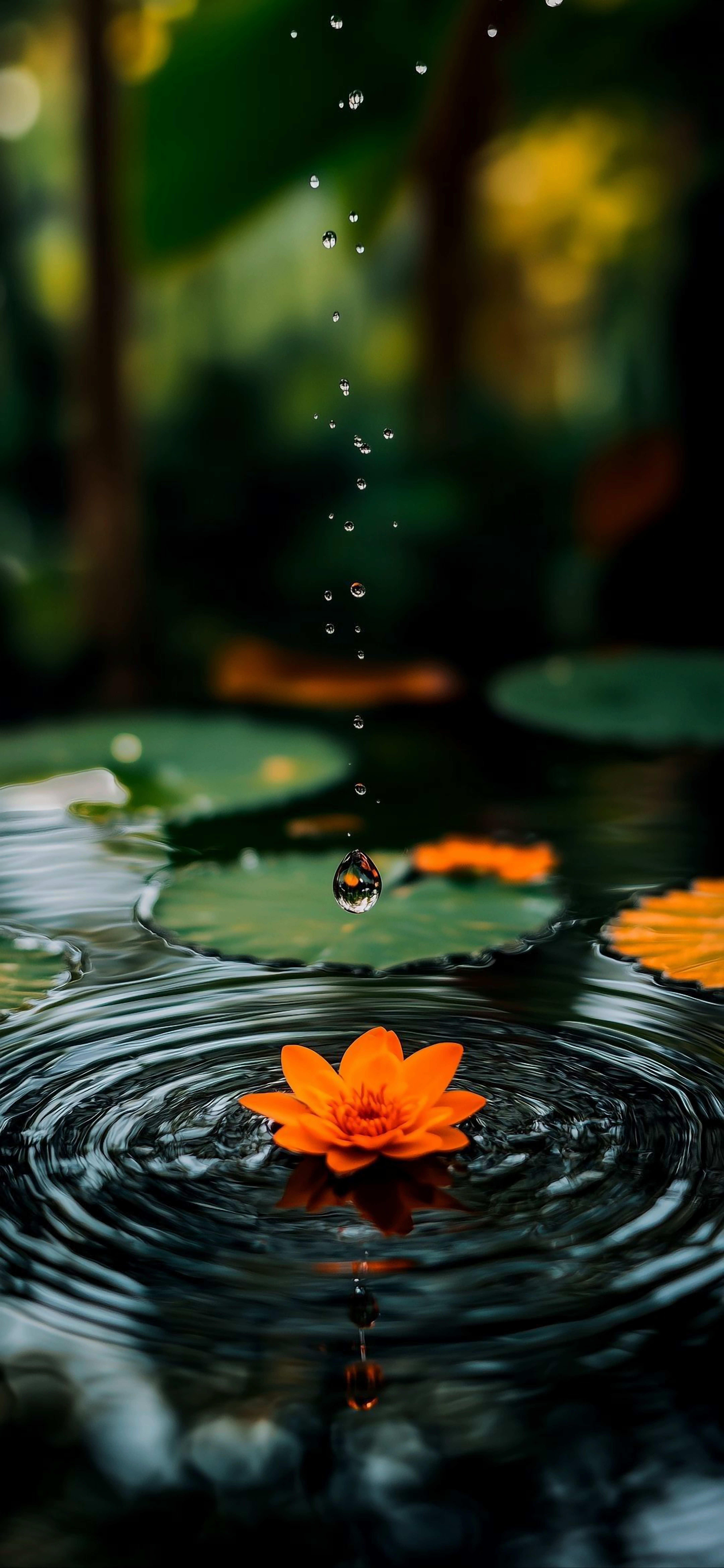A vibrant orange lily rests peacefully on the water as a droplet falls, creating captivating ripples. This wallpaper captures the beauty and tranquility of nature's gentle moments.