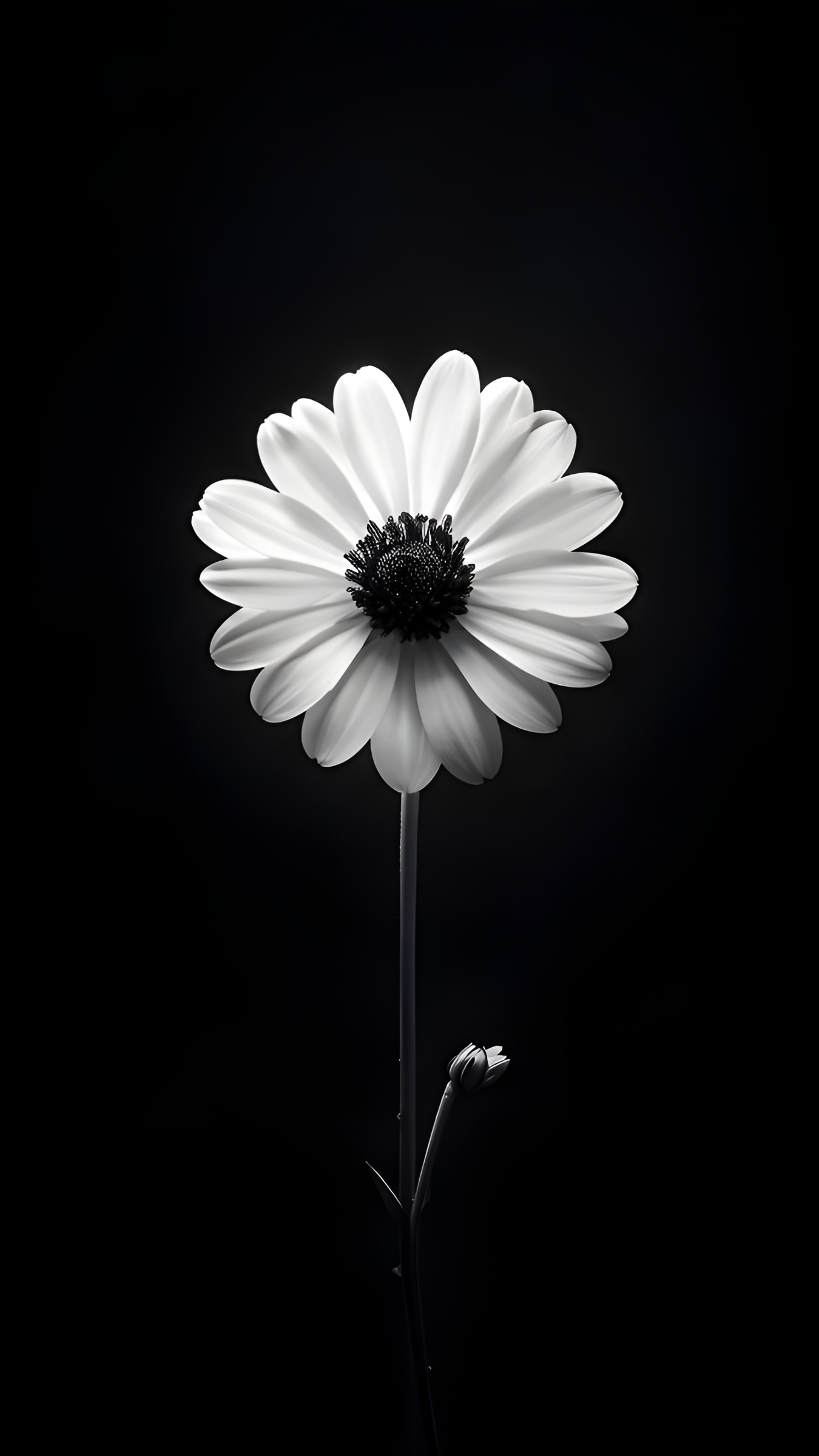 A single daisy, captured in stark black and white, stands against a deep, dark backdrop. Its delicate petals radiate light, offering a moment of serene beauty and minimalist elegance.