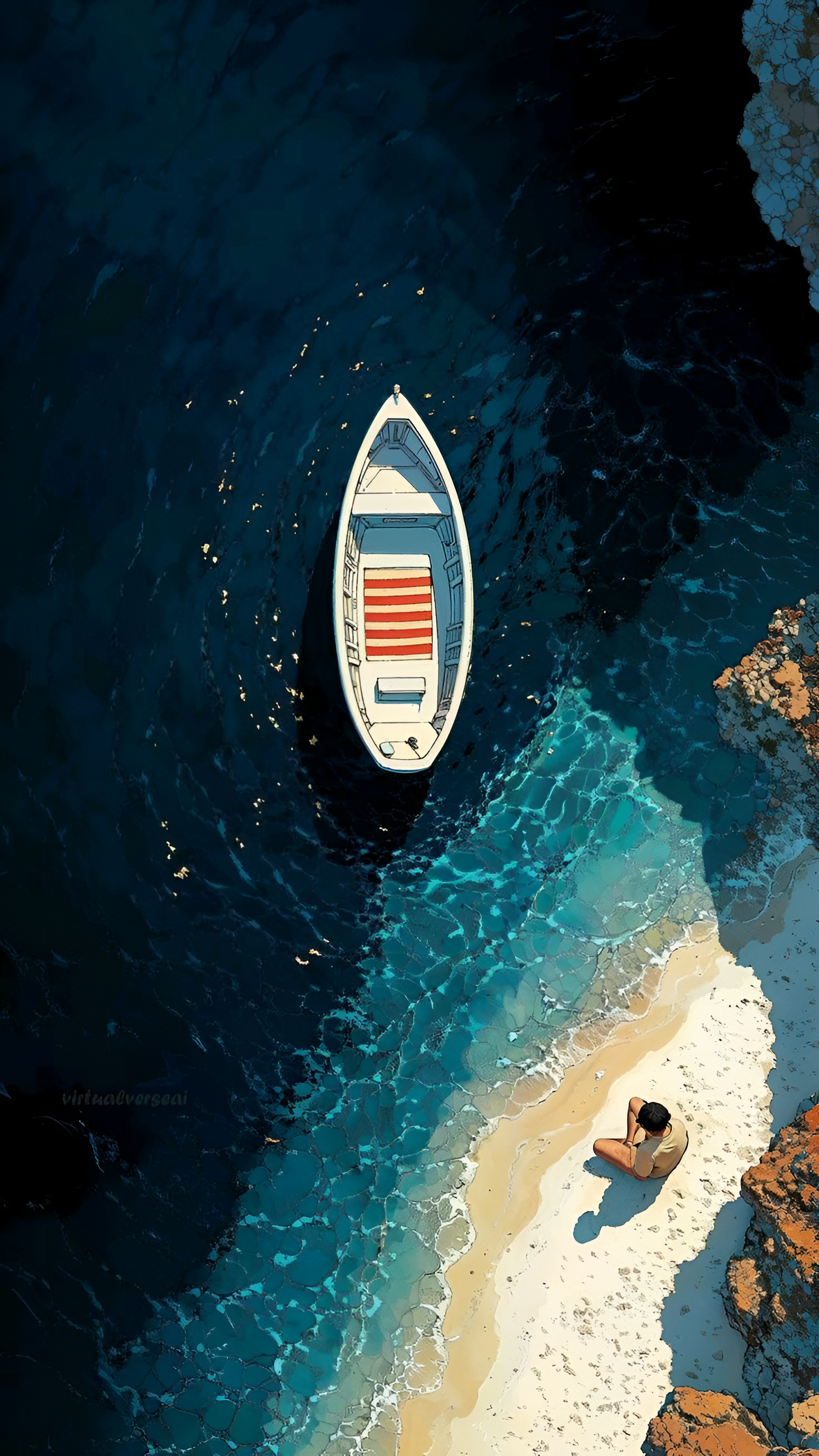 Escape to paradise with this stunning aerial view. A lone boat floats on crystal clear turquoise water near a sun-drenched beach, inviting moments of peace and tranquility. Perfect for dreaming.
