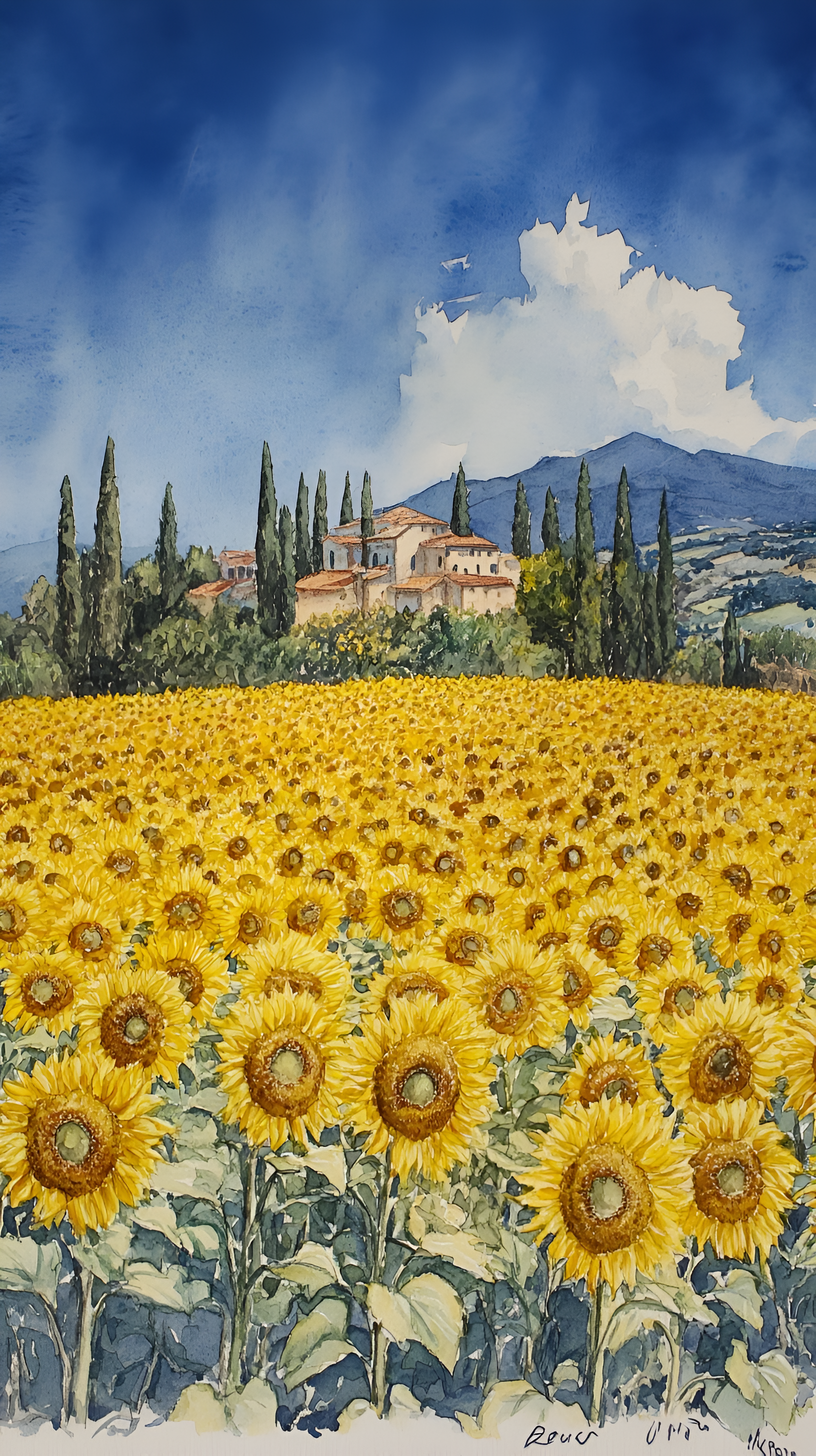 Immerse yourself in a golden vista with this watercolor painting of a vast sunflower field in Tuscany. Experience the warmth and serenity of the Italian countryside with every glance.