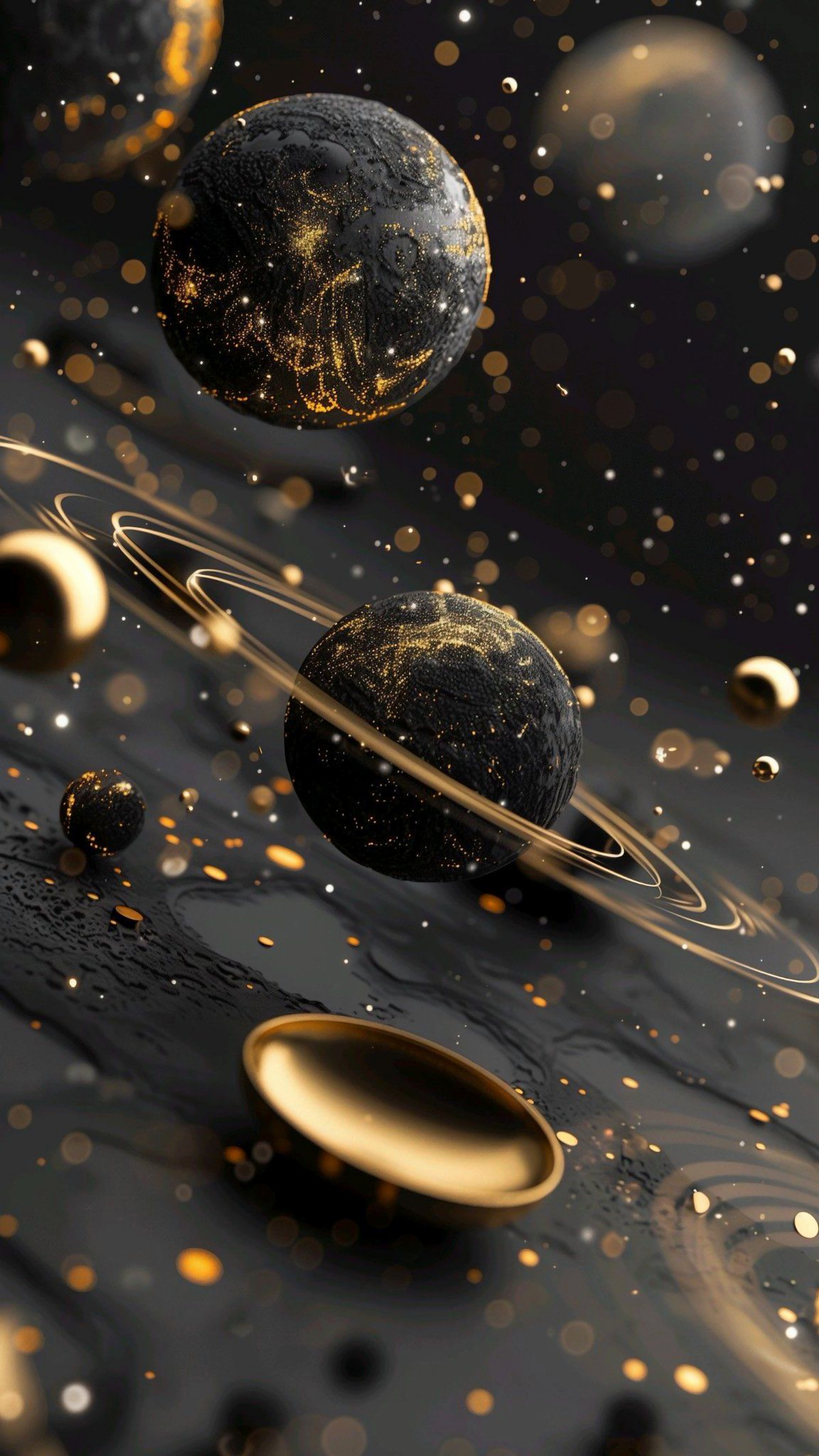 Immerse yourself in this luxurious abstract wallpaper. Dark planets glitter with gold dust, floating amidst shimmering bokeh and celestial rings, creating a sense of otherworldly wonder.