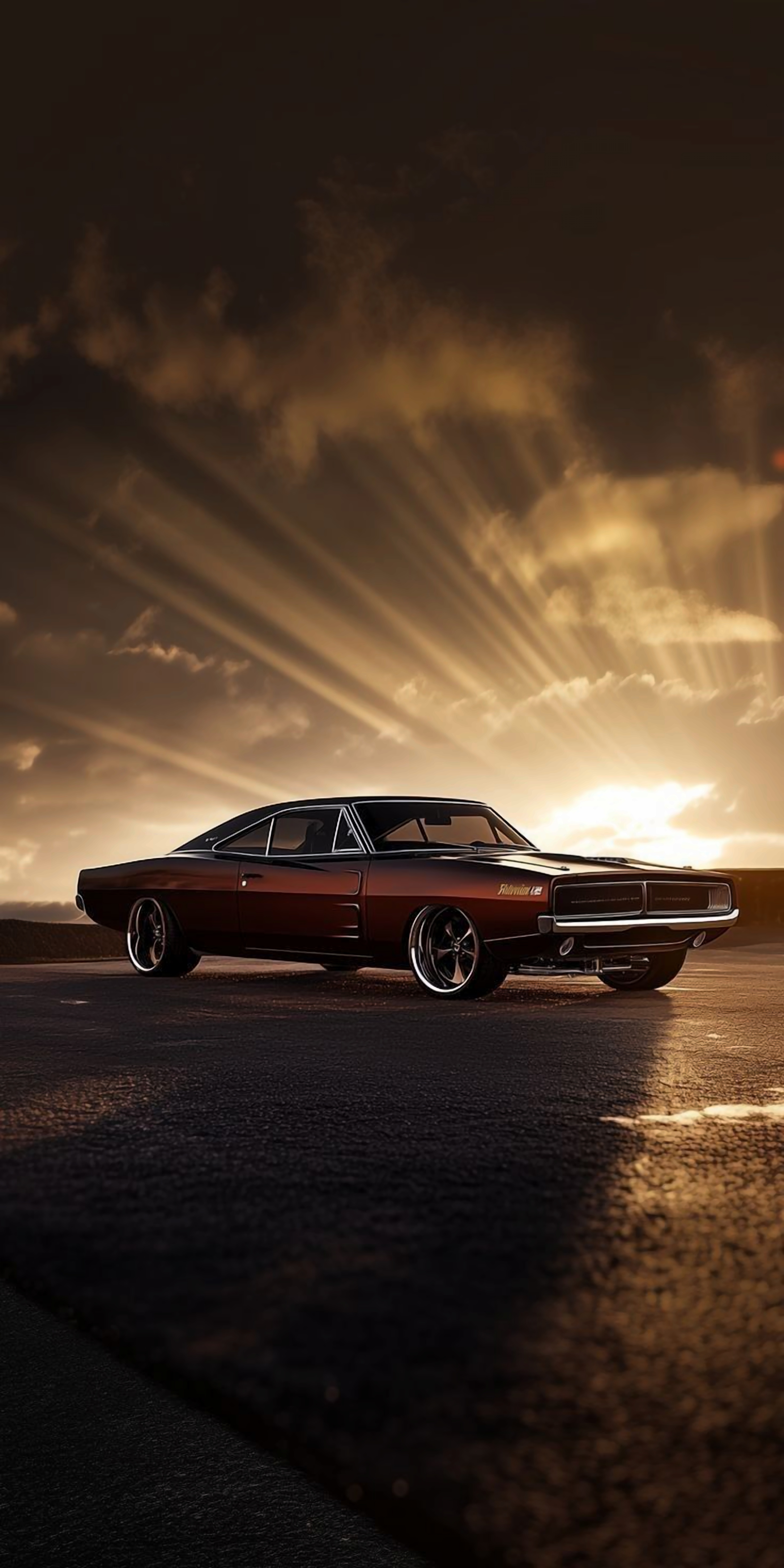 Experience the raw power of this classic American muscle car, bathed in the golden light of a dramatic sunset. Let this vintage dream ignite your passion for automotive excellence.