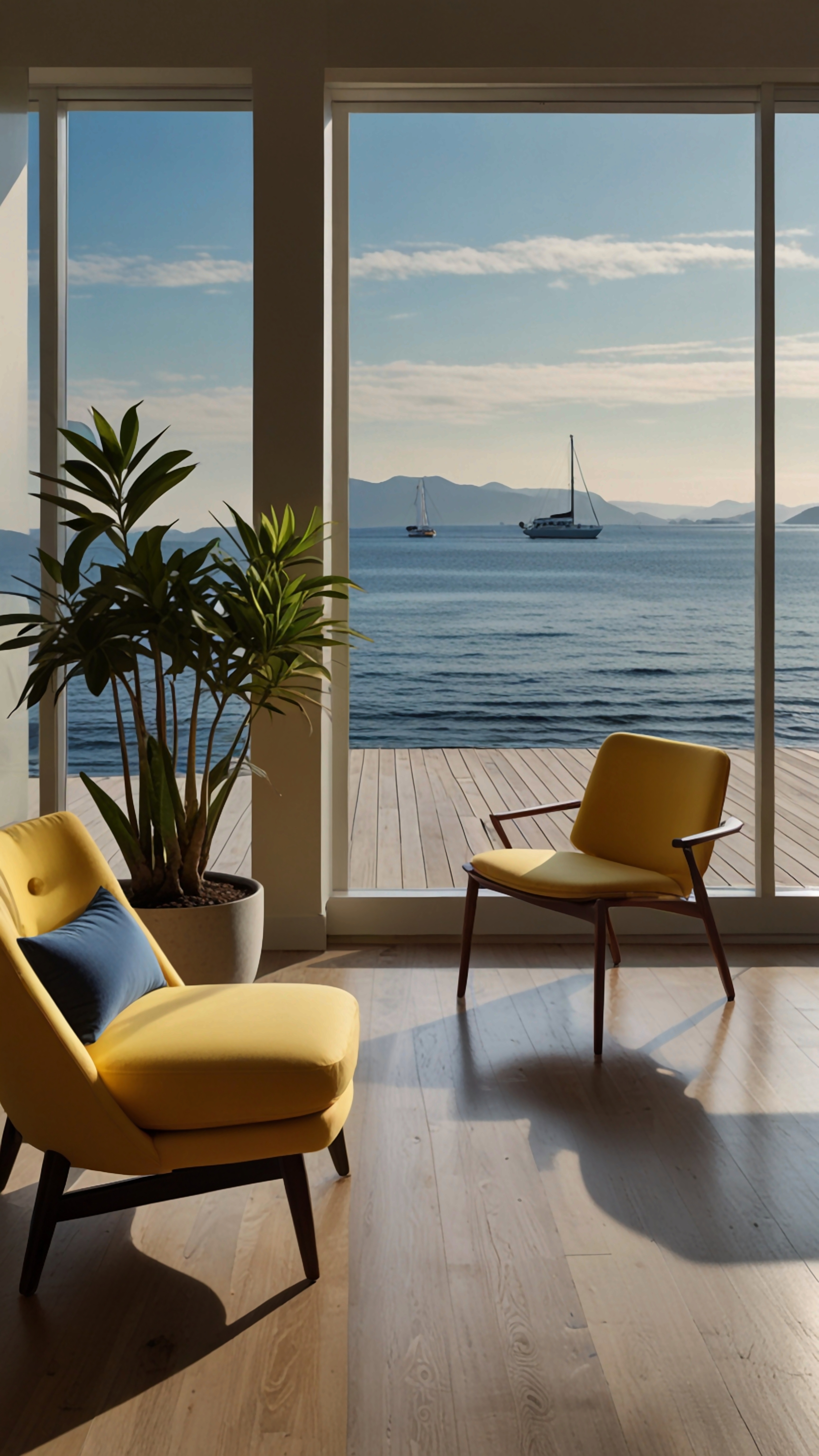 Escape to coastal calm with this wallpaper. The view features two yellow chairs and a seascape with sailboats creating a tranquil and inviting atmosphere. Perfect for adding a touch of serenity to any space.