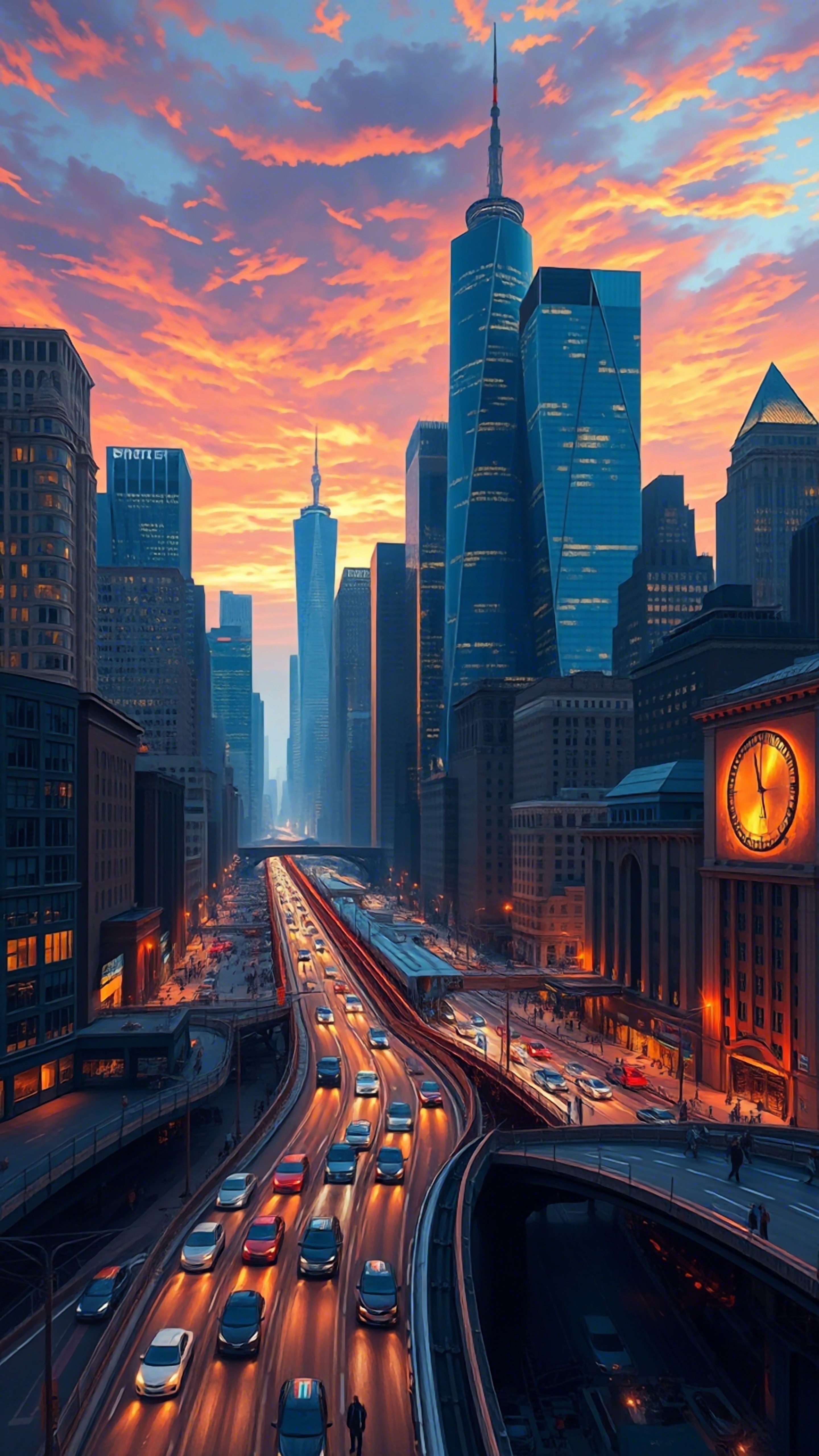 Experience the vibrant energy of the city at sunset. This stunning wallpaper captures the moment the sun paints the cityscape in brilliant shades of orange and red. Perfect for bringing a touch of urban vibrancy to your screen.