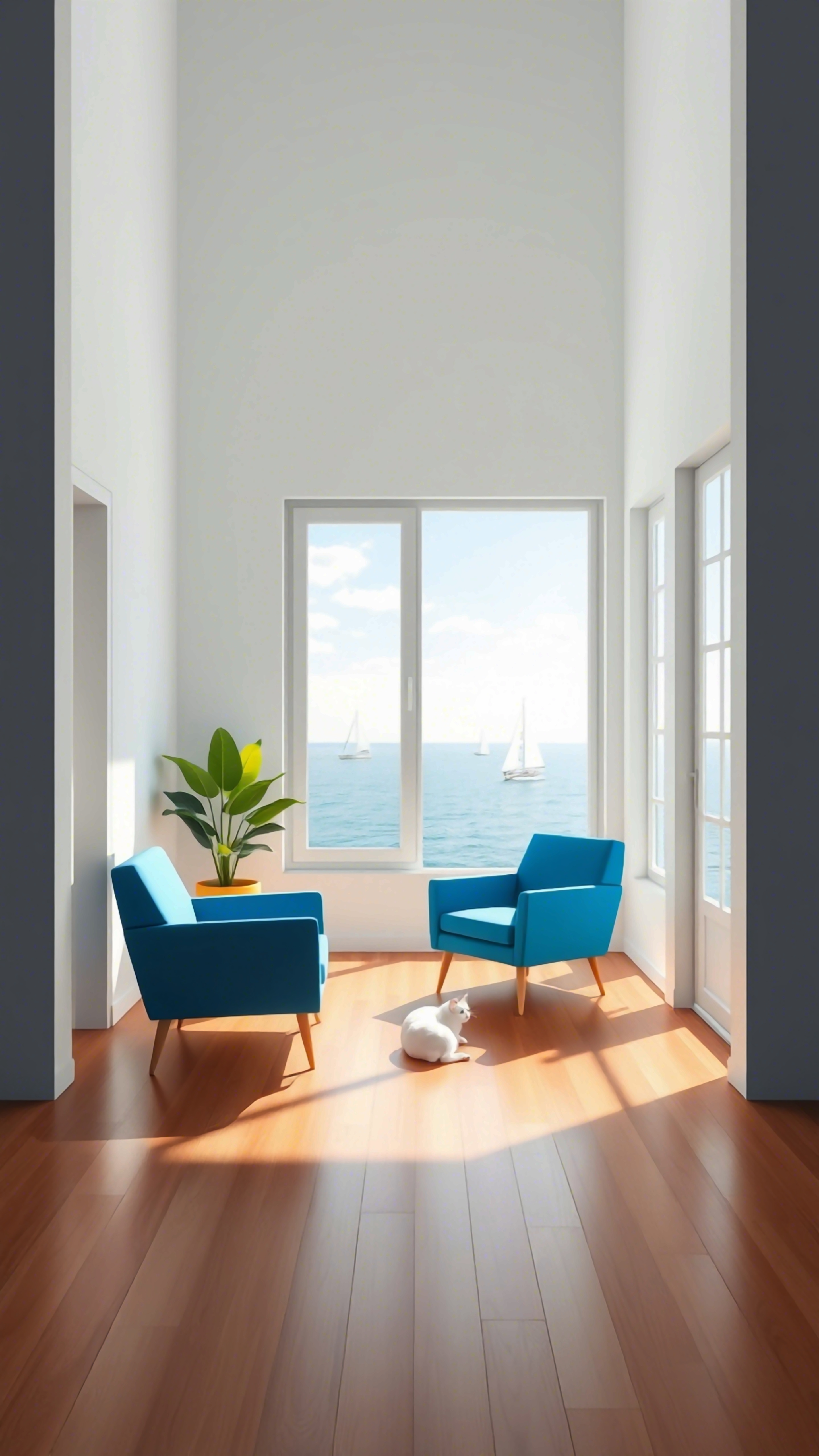 Bask in the serenity of this sun-drenched coastal home. Featuring blue armchairs, a peaceful white cat, and a breathtaking ocean view with sailboats, this wallpaper evokes a sense of tranquility and escape.