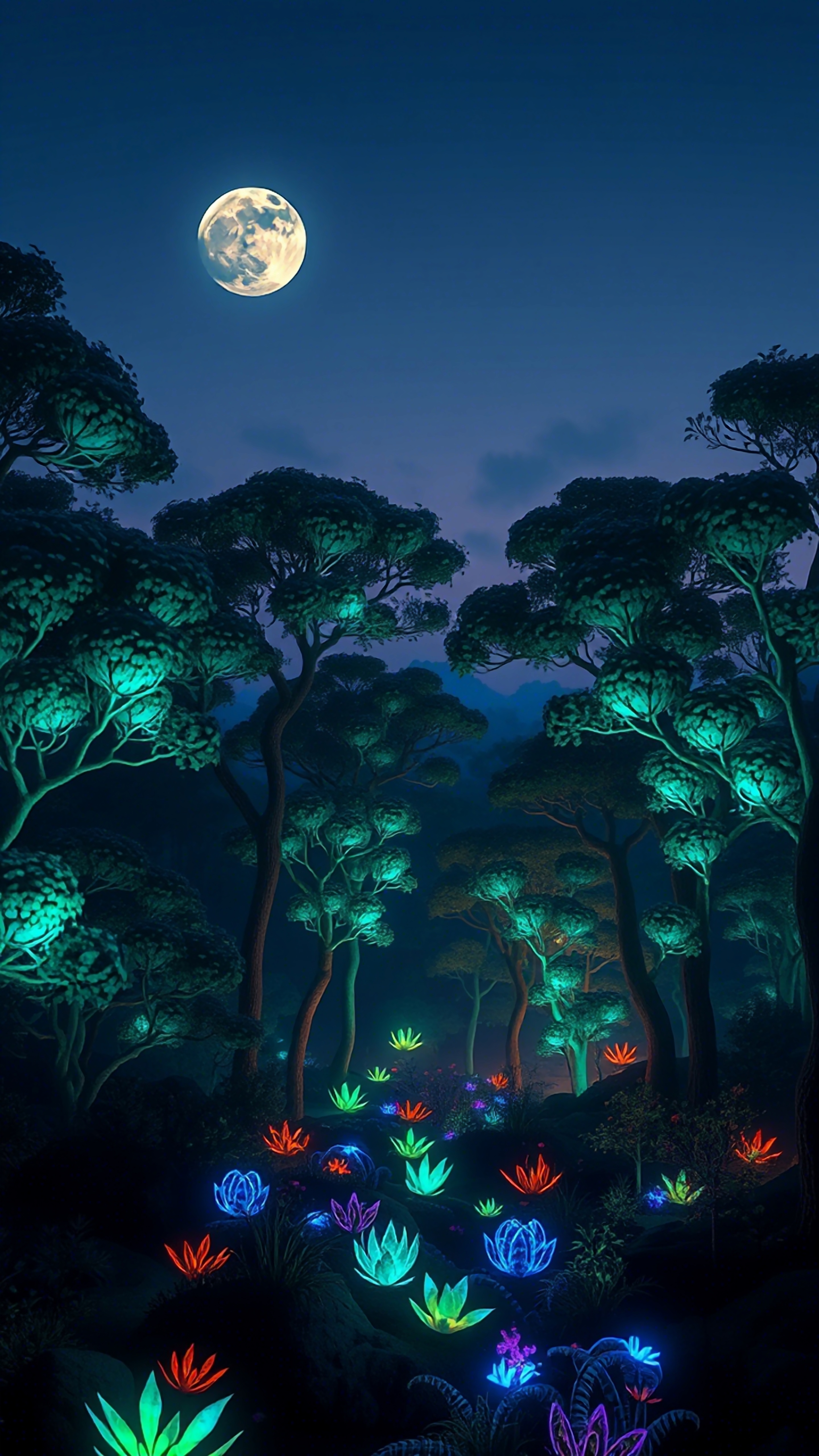 Enchanting night forest wallpaper featuring glowing trees and vibrant, neon-lit flora under a captivating full moon. Perfect for adding a magical, otherworldly touch to your screen.