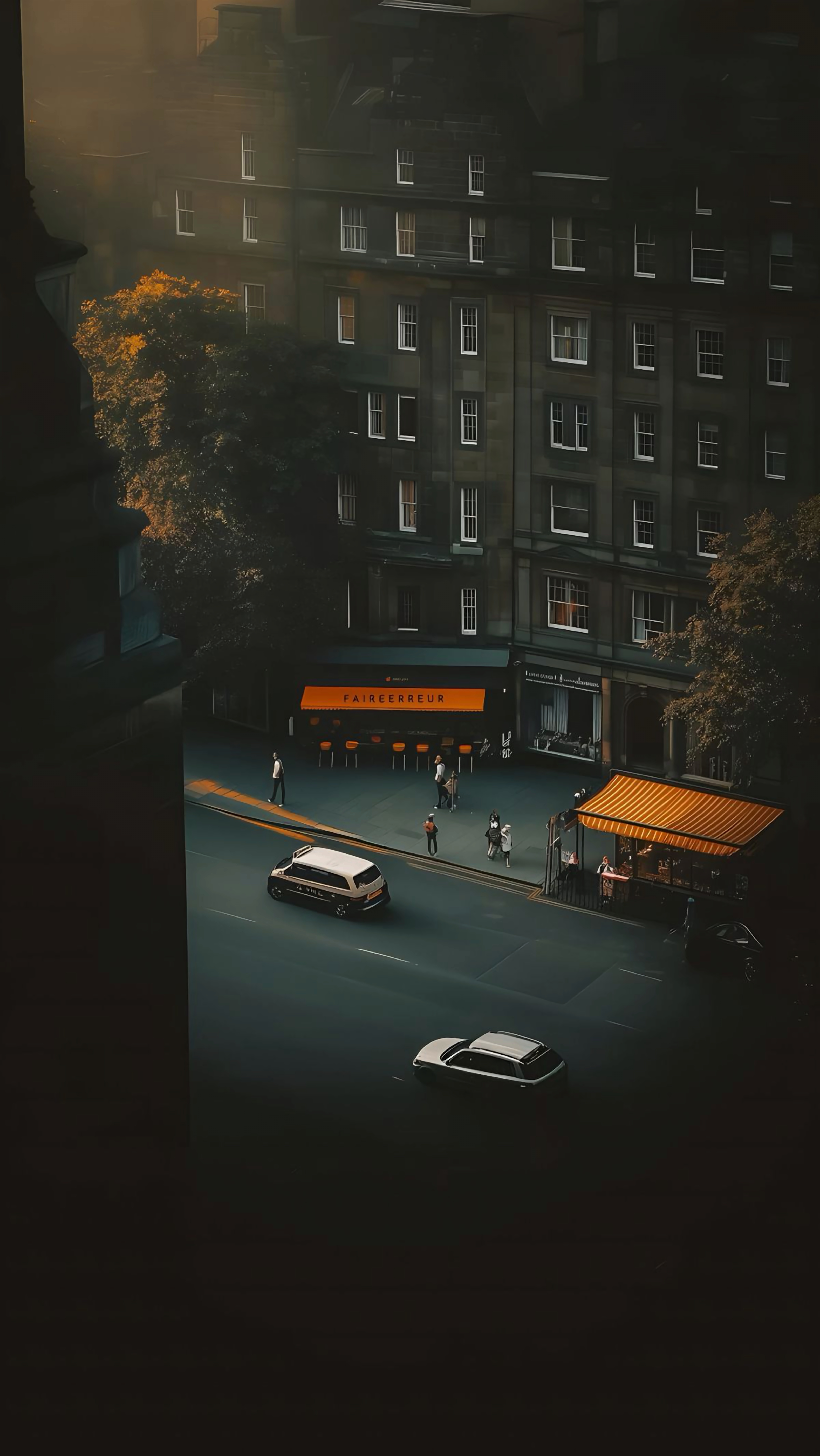 Capture the quiet beauty of Edinburgh in the evening. Golden light kisses the buildings and street as people stroll by, creating a moment of peace in the city.