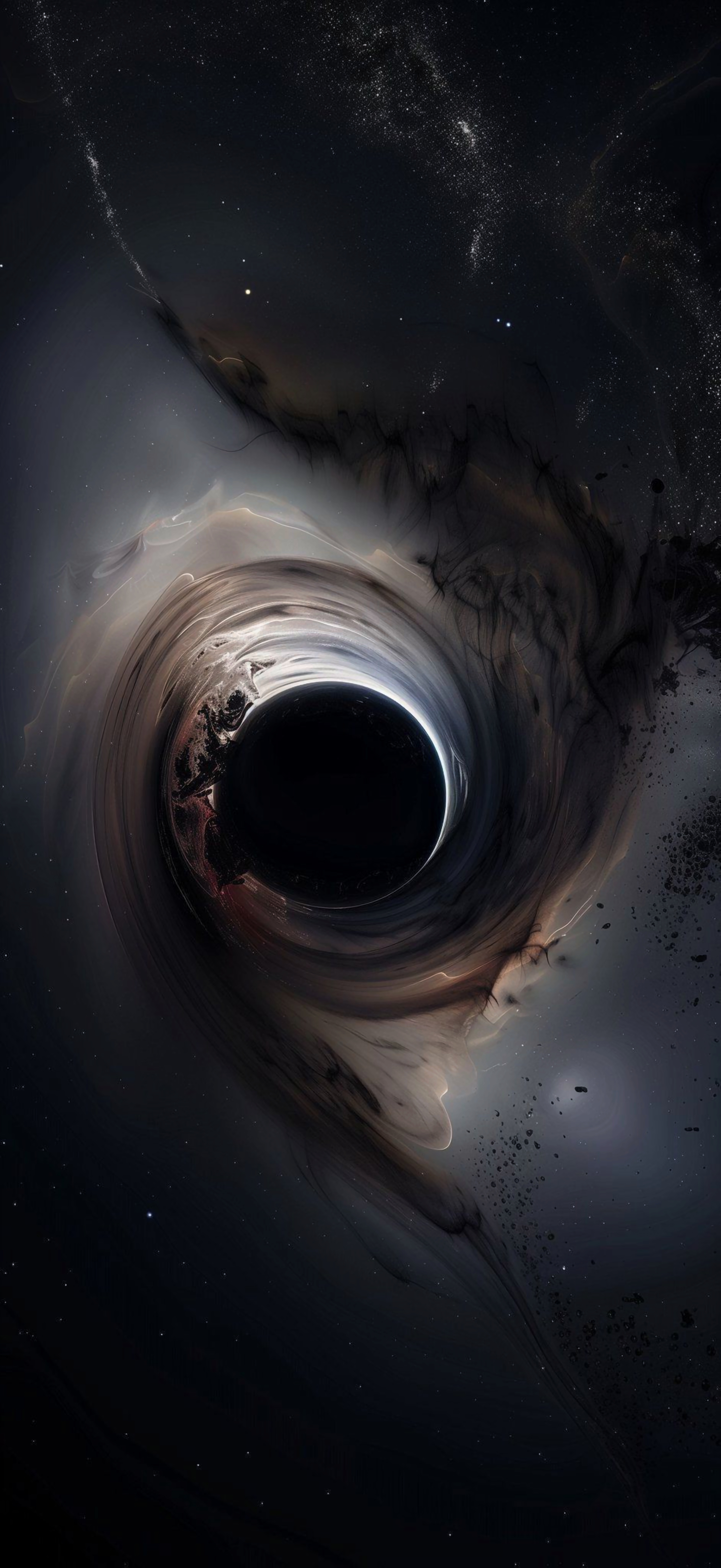Stare into the infinite with this mesmerizing black hole wallpaper. Swirling cosmic dust and distant stars surround the event horizon, creating a deep, immersive feel.