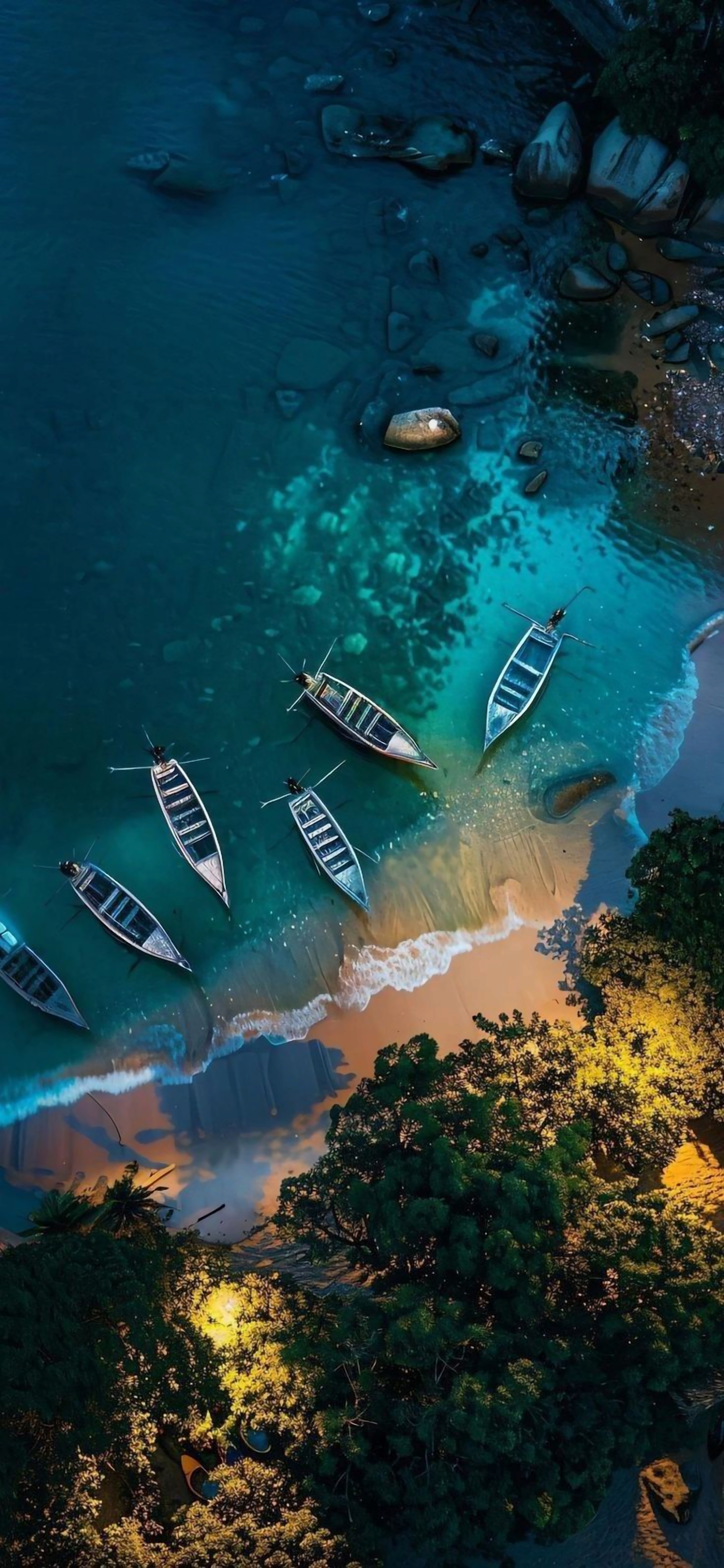 Dreamy aerial view of traditional boats resting on a sandy beach with turquoise water. Perfect for adding a touch of coastal serenity to your screen.