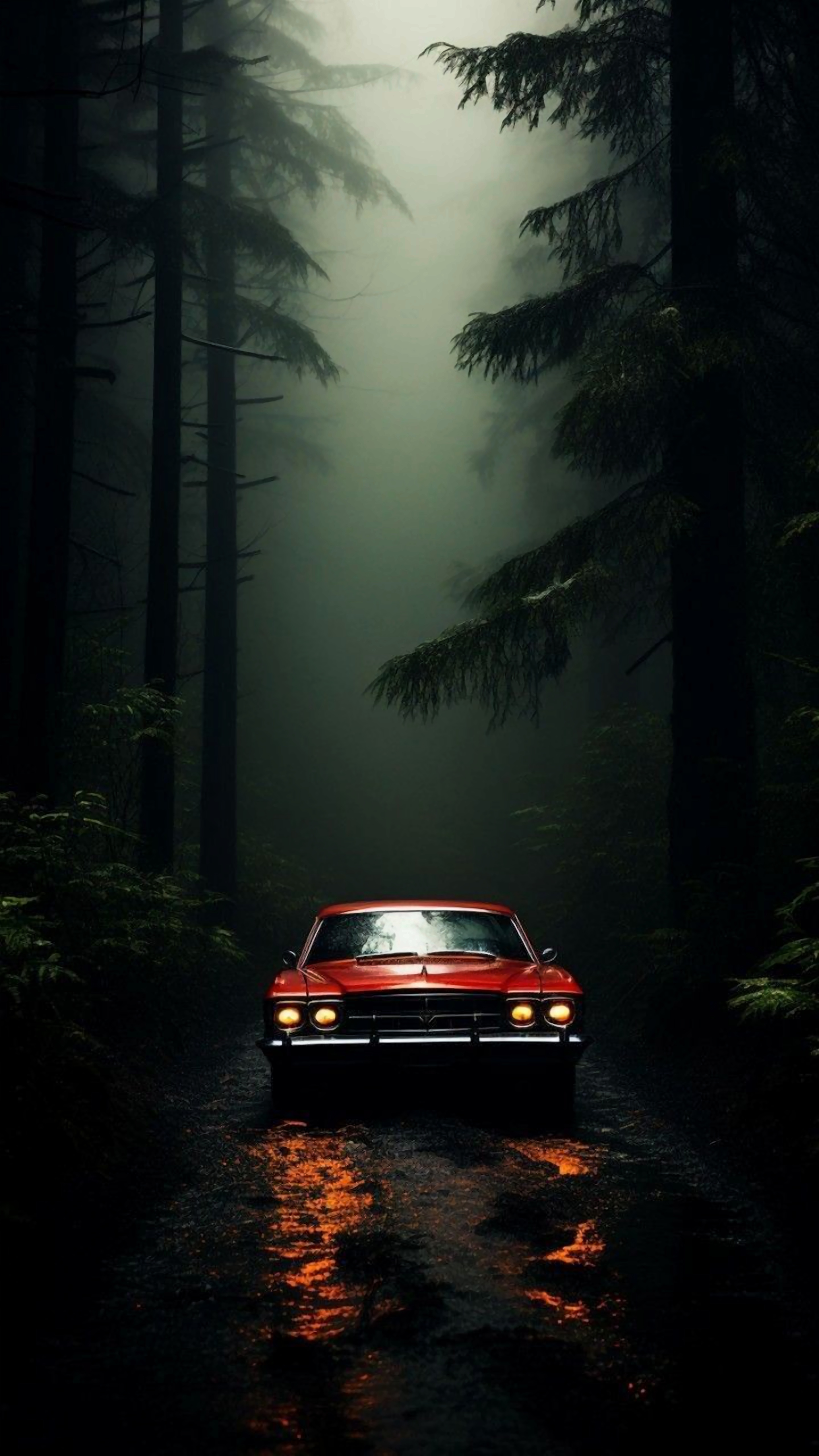 A classic red car shines in a dark, misty forest, its headlights cutting through the gloom. The moody scene evokes a sense of mystery and adventure, perfect for adding drama to your device.
