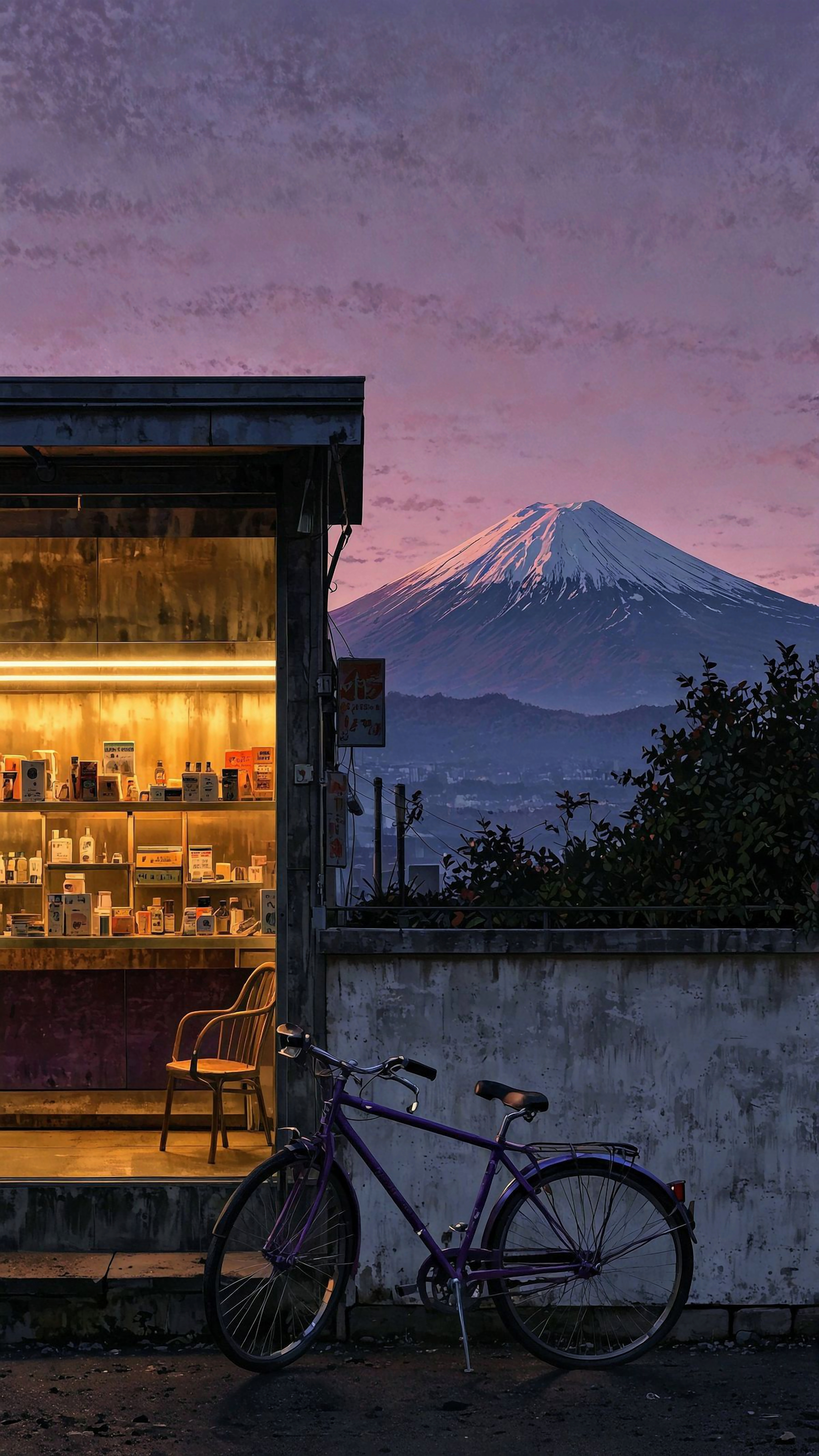 A serene dusk scene featuring a purple bicycle parked near a warmly lit storefront, with the majestic Mount Fuji painted against a soft, colorful sky. Evokes a sense of calm and nostalgic beauty.