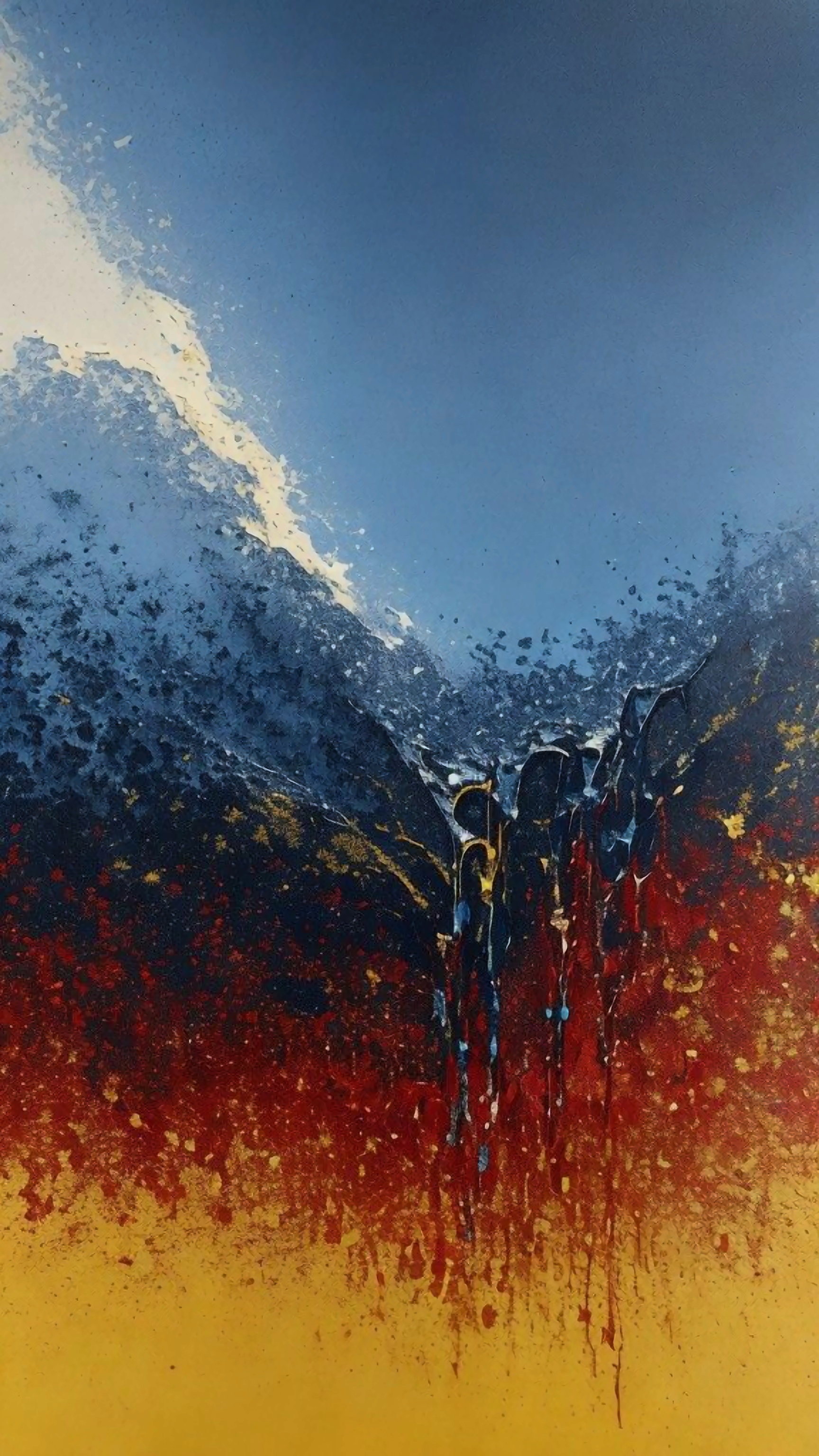 Immerse yourself in this abstract landscape painting, featuring rich blues, reds, and golds blending together. Its bold texture and unique composition creates an inspiring and vibrant effect. Perfect as an eye-catching wallpaper.