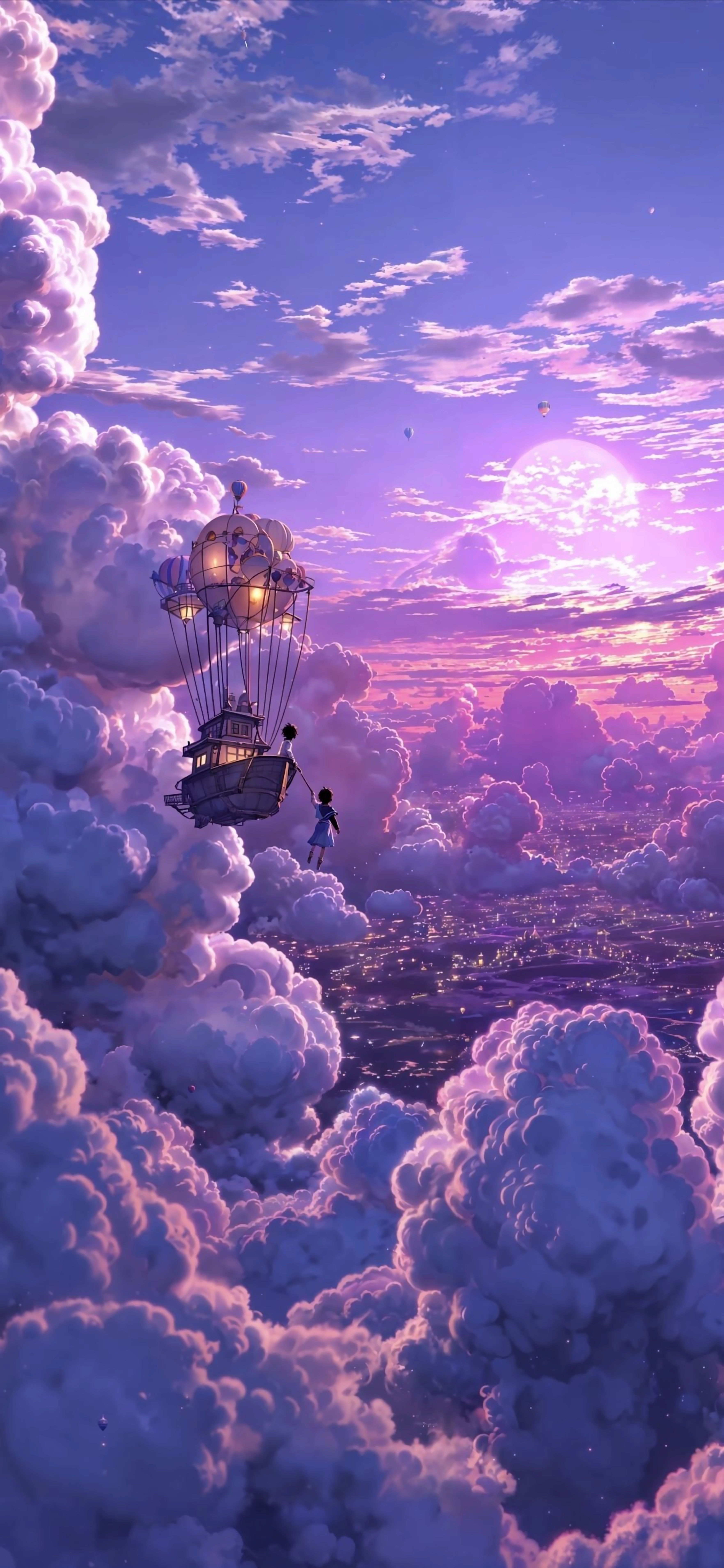 Soar above the clouds in a whimsical airship, painted in dreamy hues of purple and pink. Escape to a fantasy world with this captivating and tranquil wallpaper.