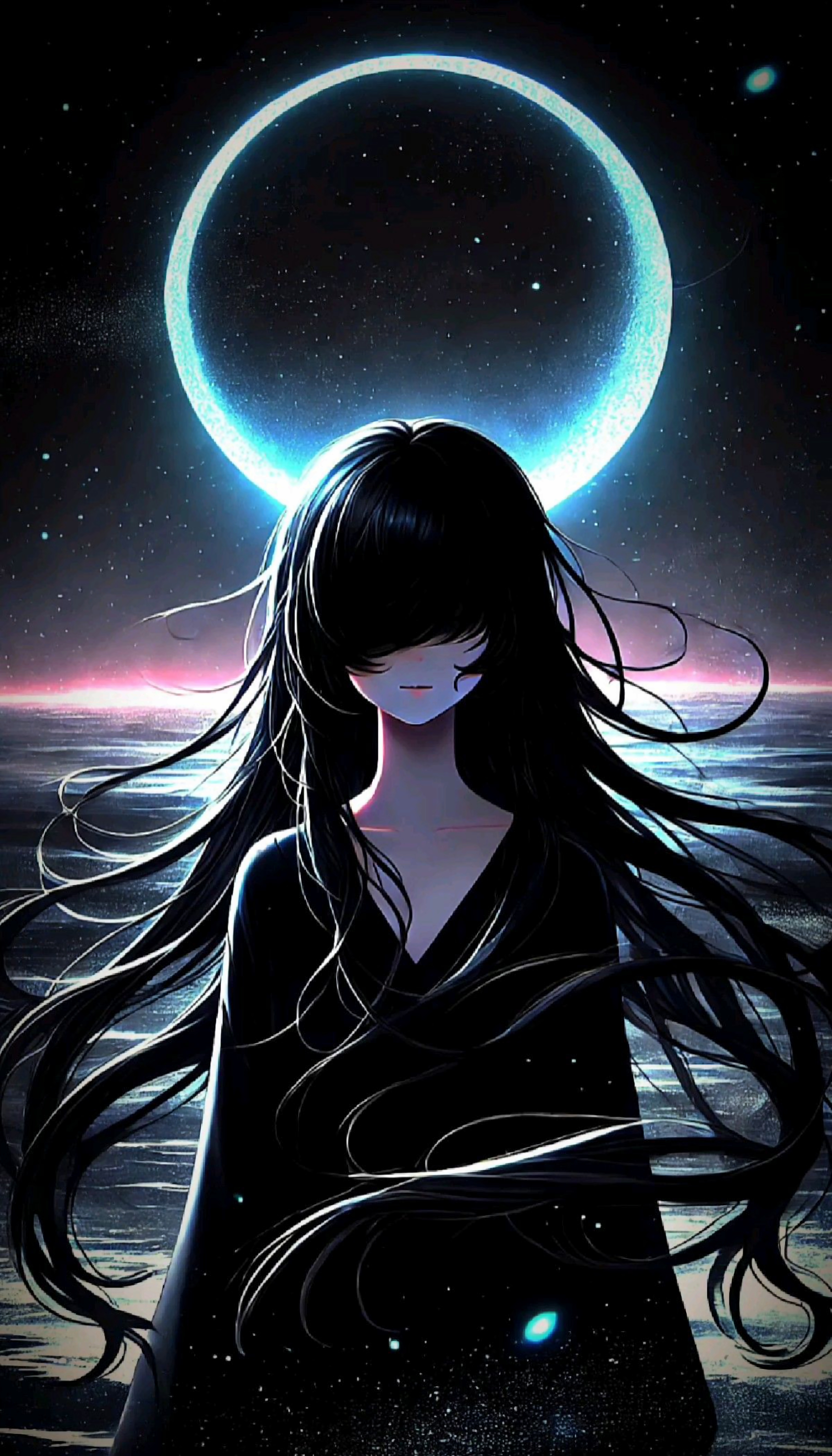Dive into a serene fantasy with this dreamy wallpaper. The silhouette of a girl against a luminous moon and starlit ocean creates a calming, otherworldly atmosphere. Perfect for adding a touch of magic to your screen.
