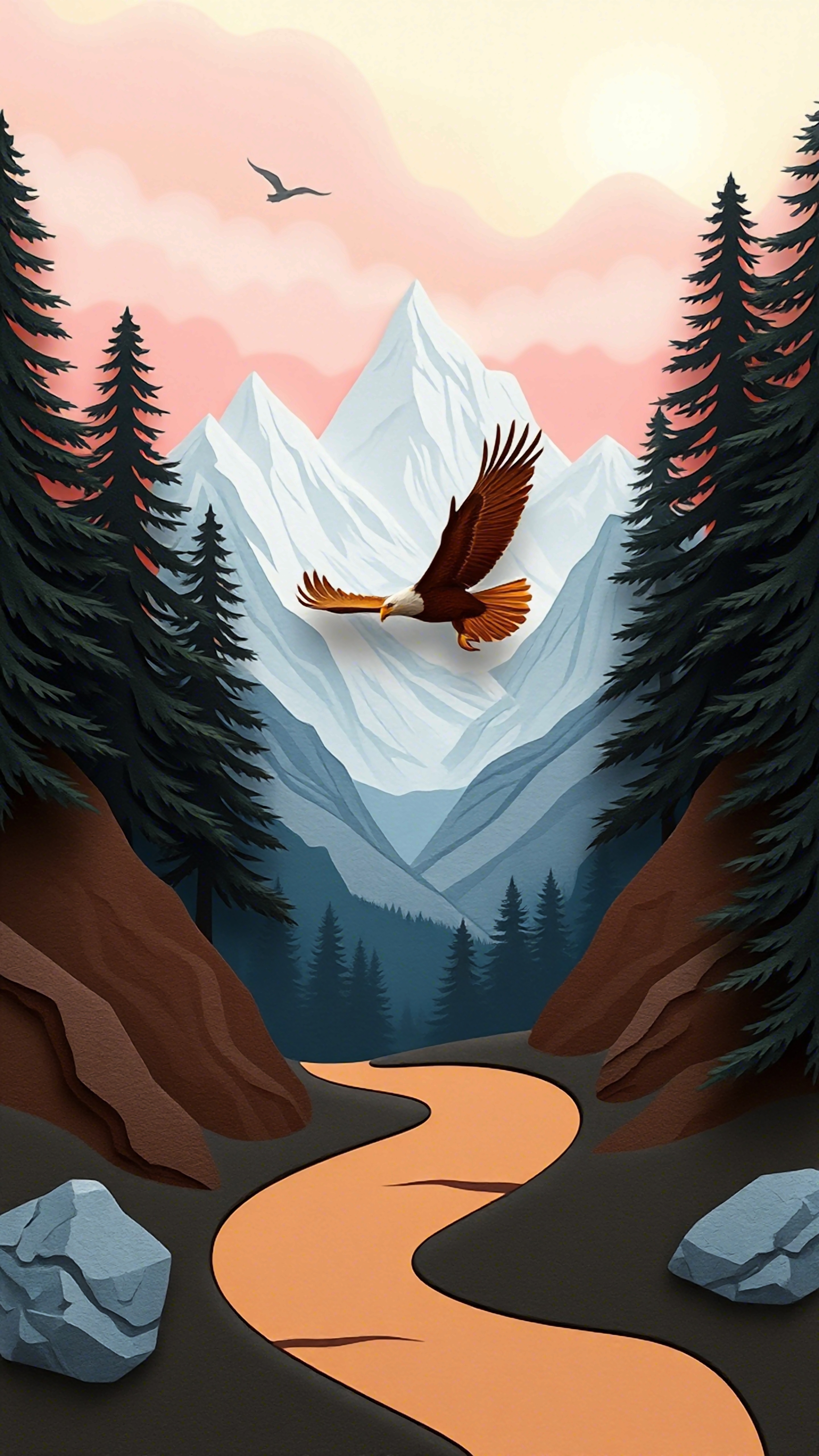 Majestic eagle soars through a stylized mountain landscape, painted in a calming palette of earth tones and cool blues. A peaceful and inspiring nature scene to brighten your day.