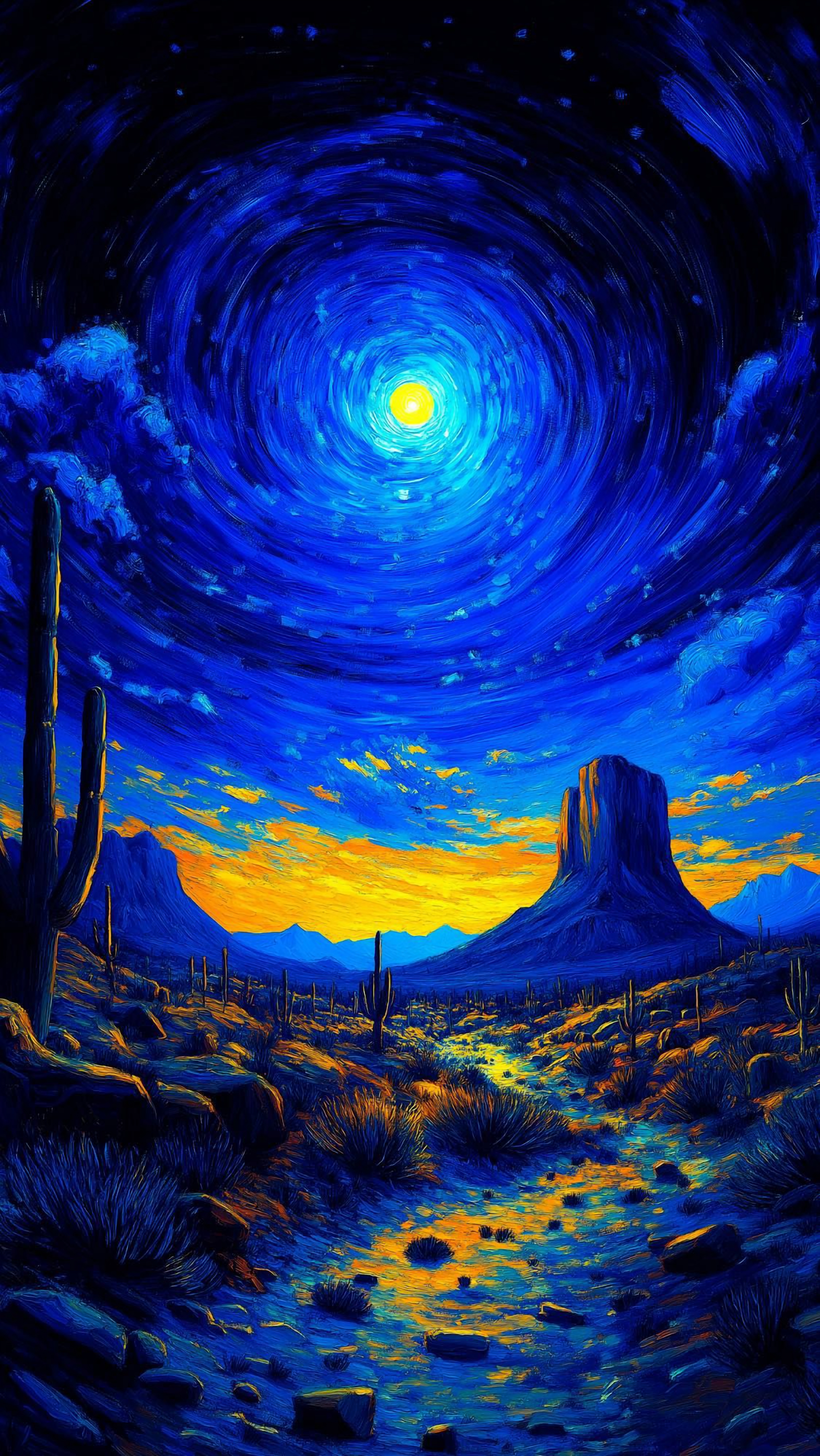 Lose yourself in this vibrant desert scene reminiscent of Van Gogh's Starry Night. Swirling skies, iconic buttes, and hardy cacti bathed in golden light create a mesmerizing and evocative landscape. Bring the beauty of the desert to your screen!