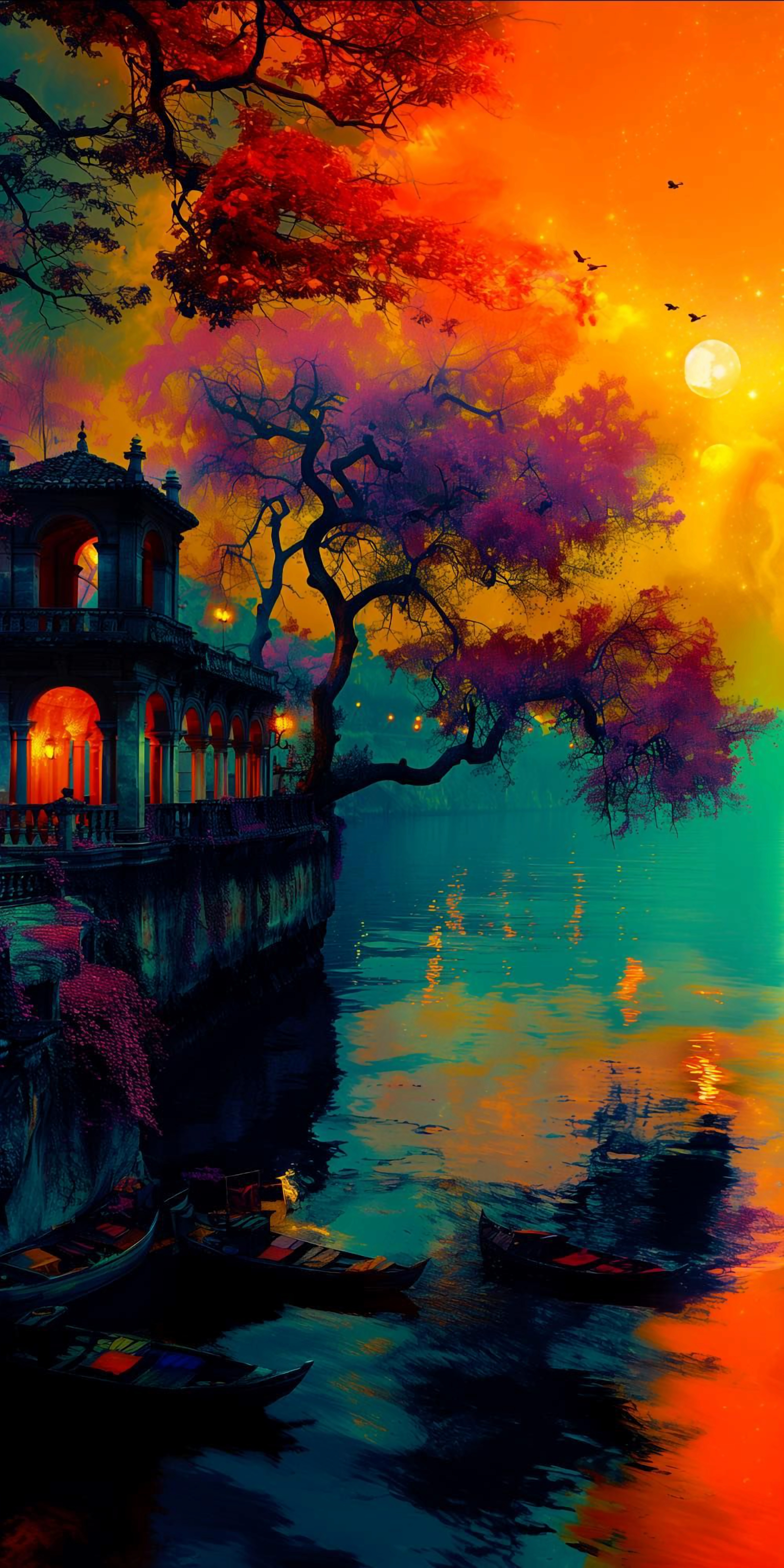 Escape to tranquility with this surreal lakeside villa. Vivid hues paint a dreamscape, reflecting in the calm water under a golden sky. A perfect serene escape for your phone.