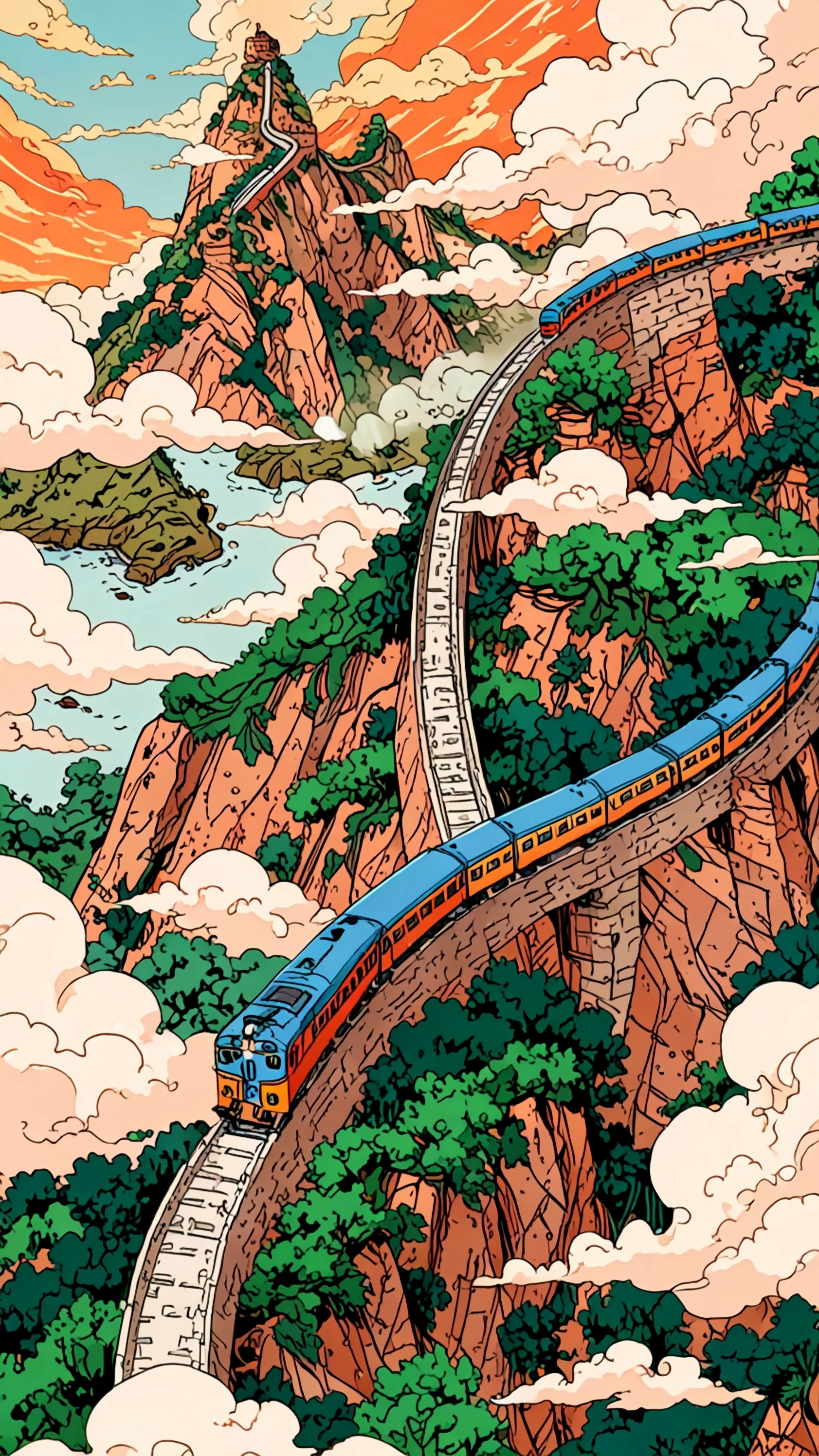 Escape into a world of adventure with this scenic train winding through majestic mountains. Lush greenery and pastel clouds create a captivating and calming atmosphere for your screen.