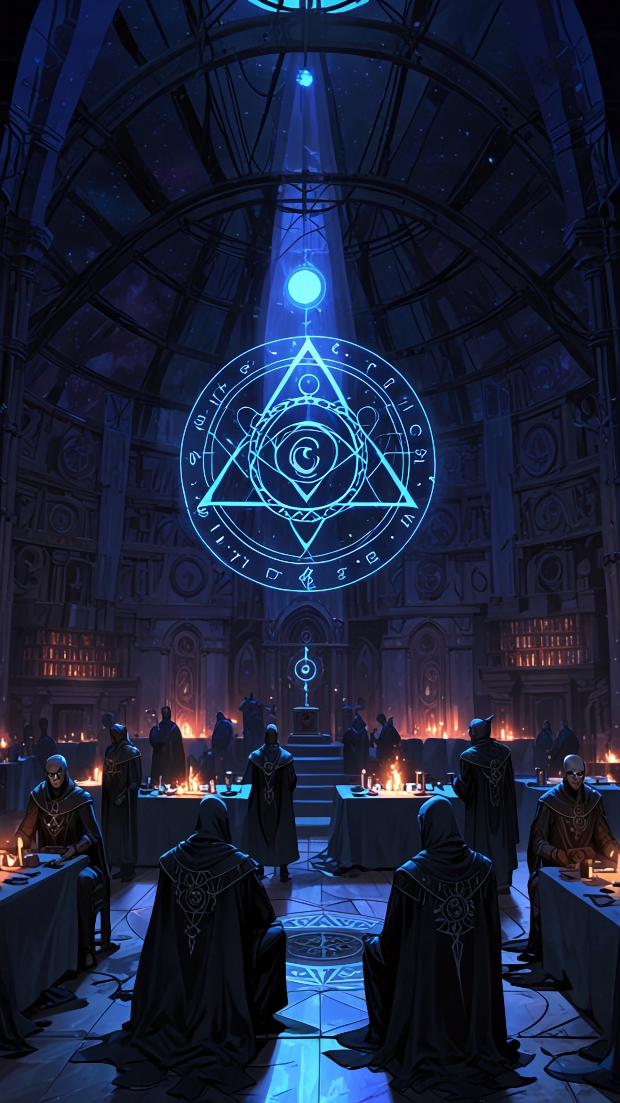 Enter a world of arcane secrets. This dark fantasy wallpaper depicts a clandestine gathering under a mystical sigil, bathed in eerie blue light and flickering candlelight.
