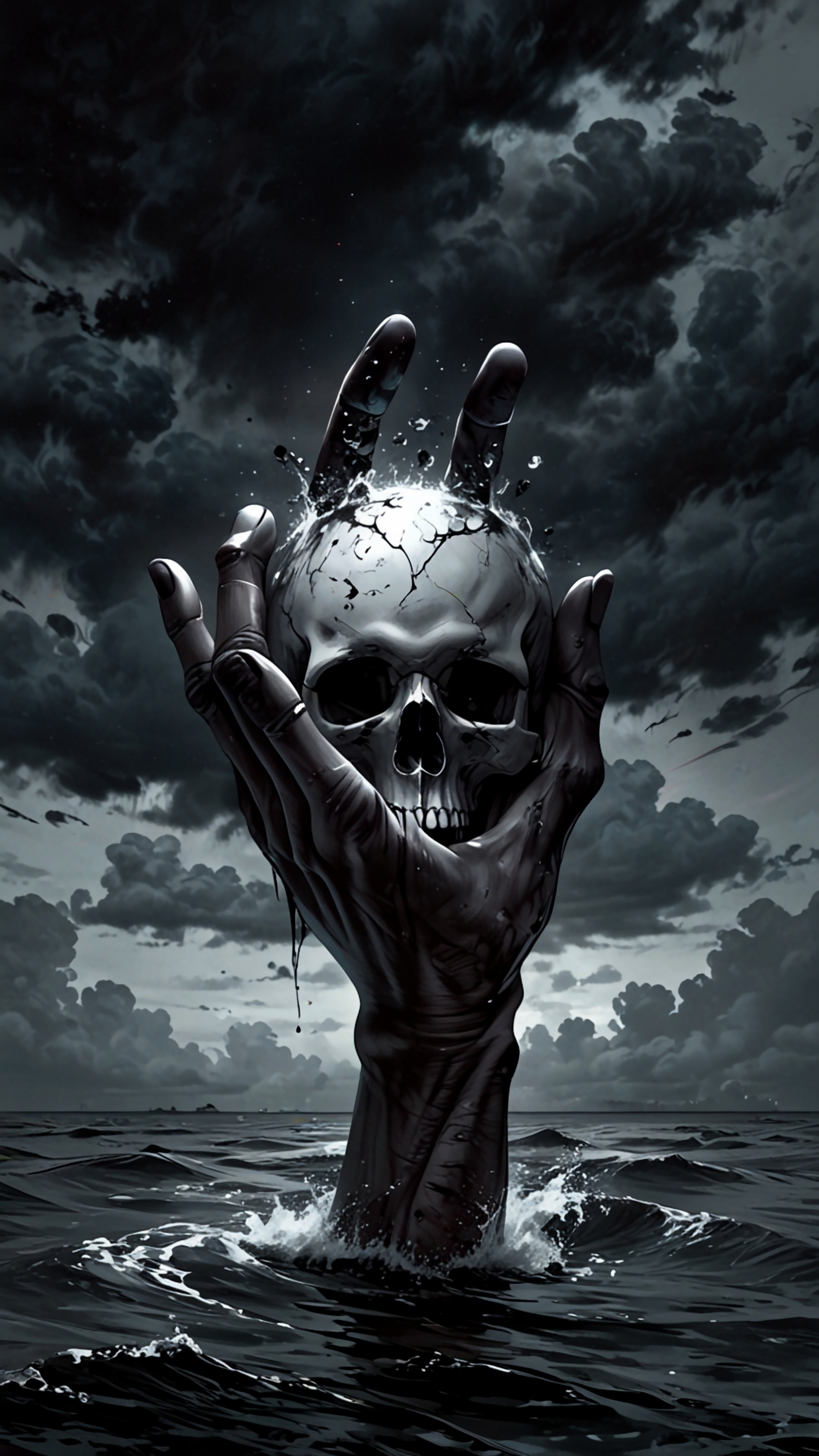 A gripping gothic scene featuring a weathered skull held aloft from stormy seas. Dark, ominous clouds fill the sky, creating a powerfully evocative and slightly unsettling atmosphere. Perfect for a unique and dramatic wallpaper.