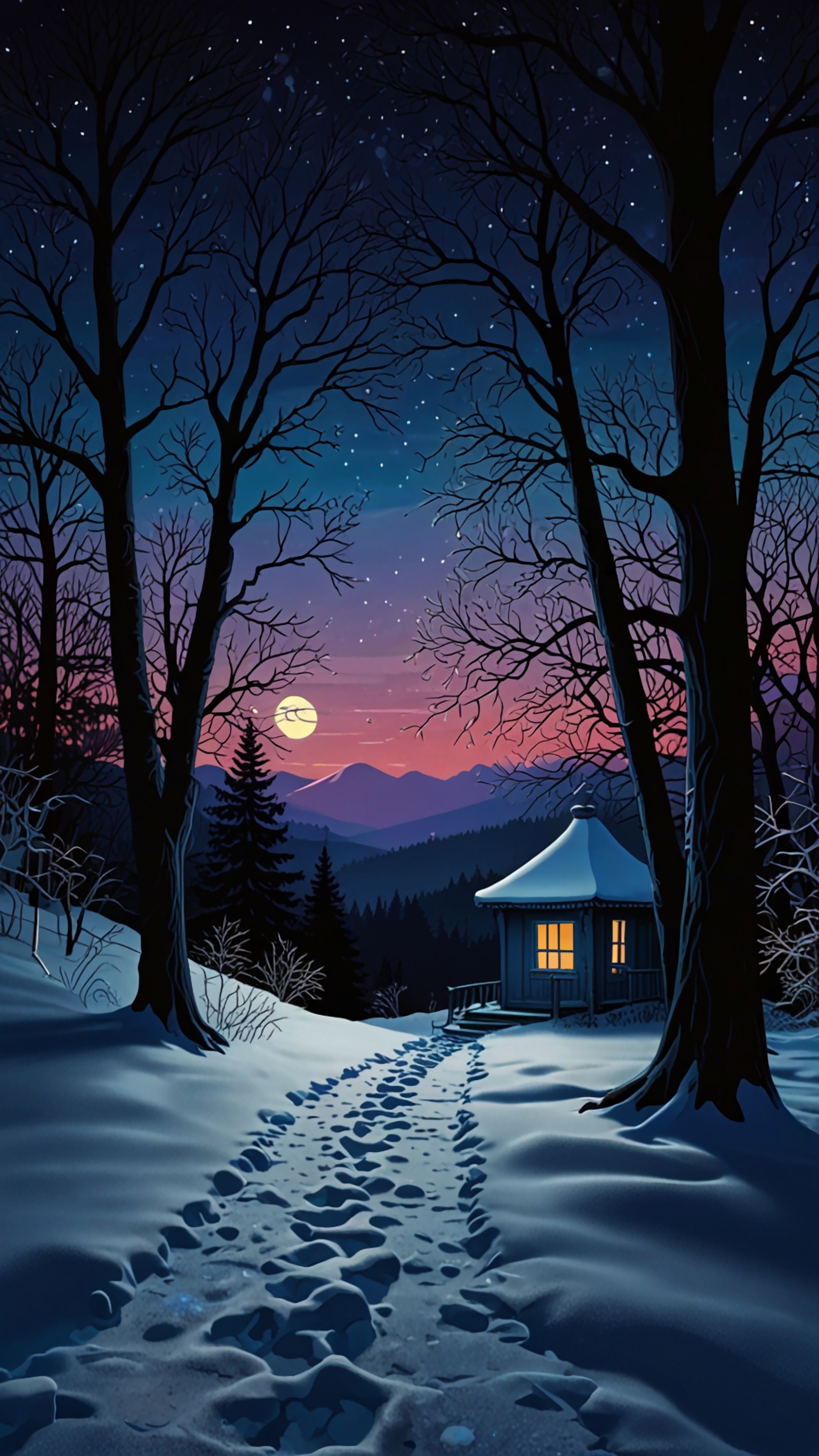 Escape to a serene winter wonderland. This cozy cabin glows warmly under the moonlit sky, surrounded by snow-covered trees and distant mountains, offering a peaceful retreat.