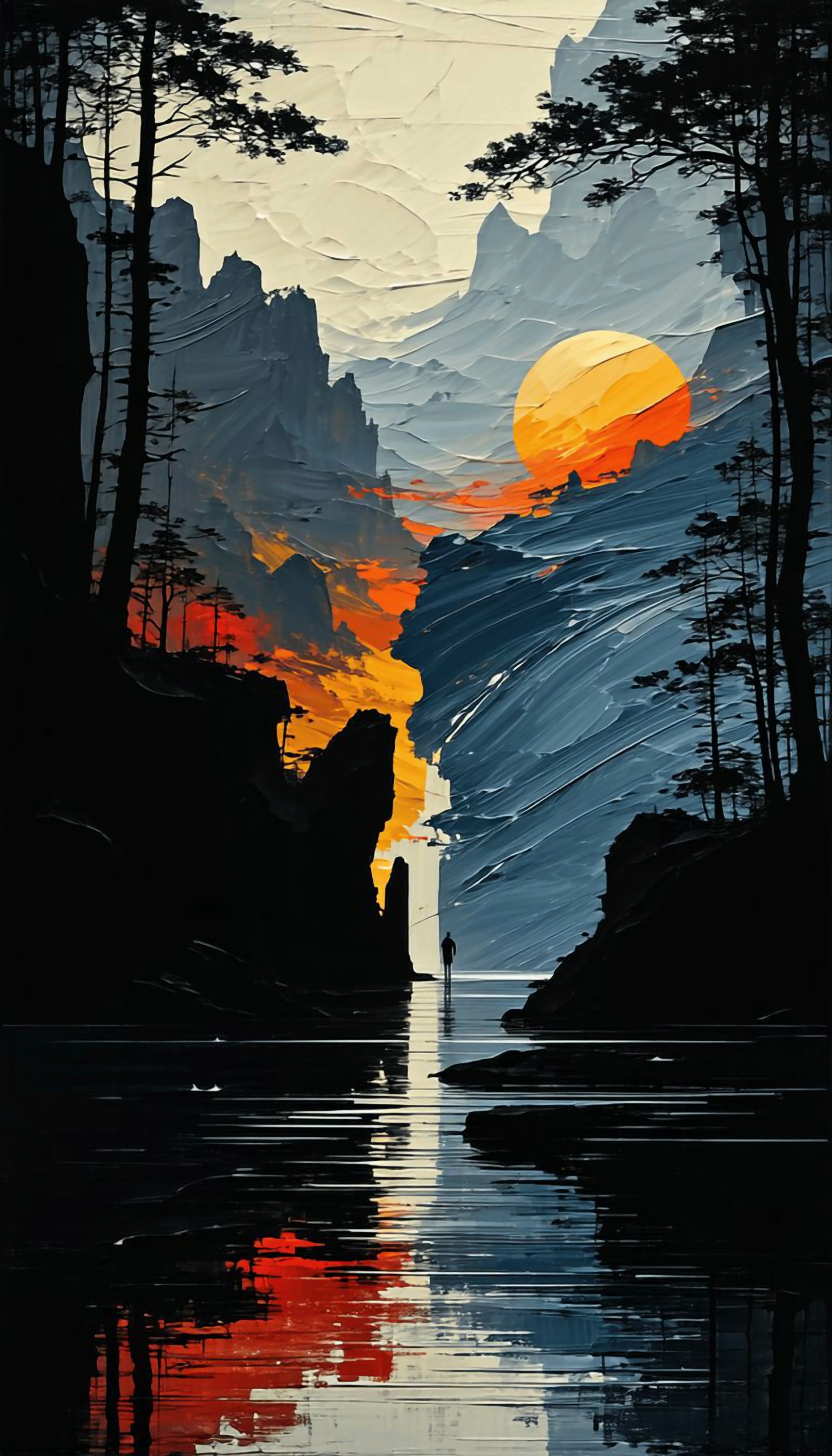 A lone figure stands at the edge of the lake, facing a fiery sunset between imposing mountains. This painterly landscape evokes serenity and contemplation in nature's grand expanse. Perfect for inspiring wanderlust.