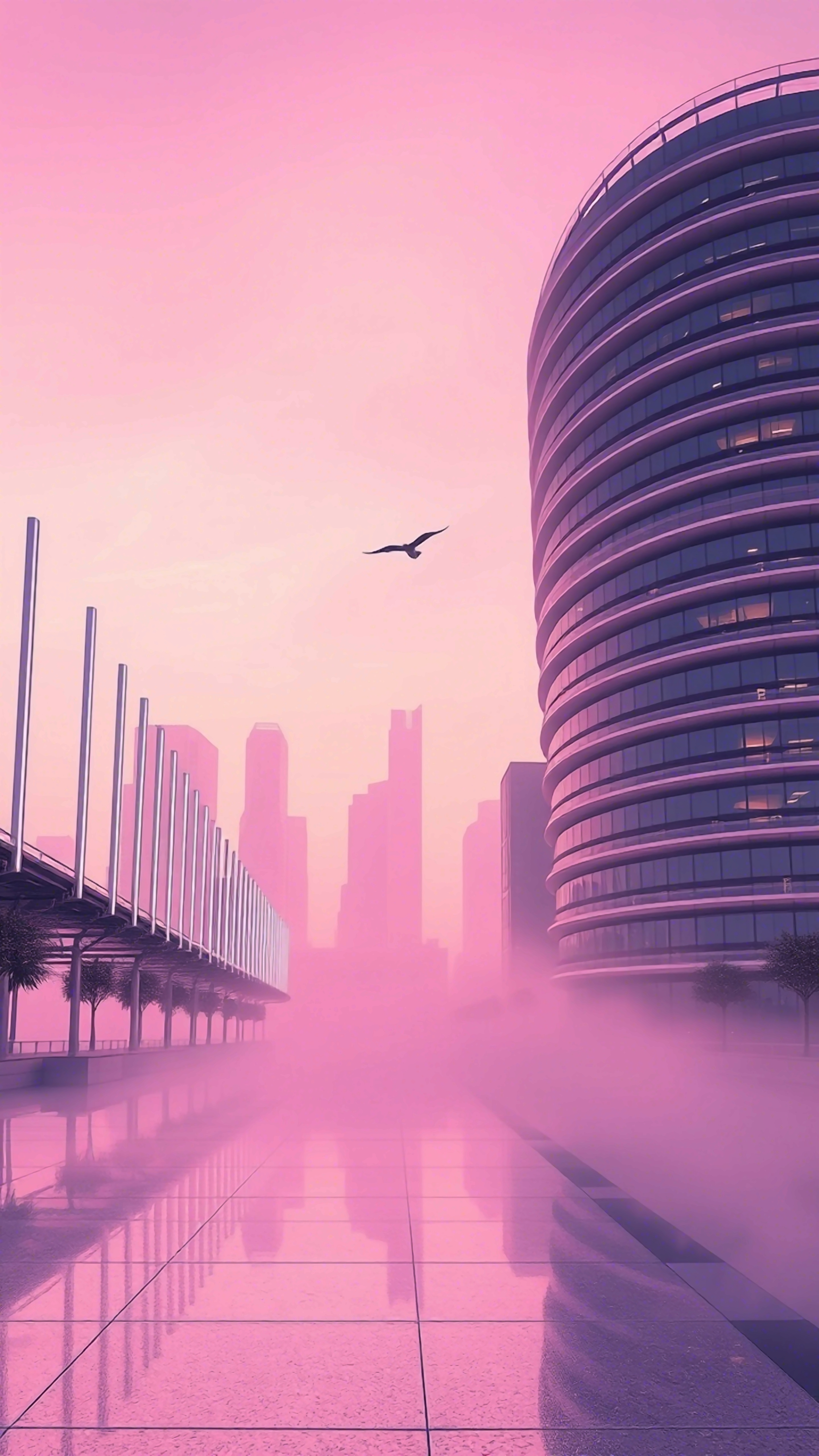 Lose yourself in this dreamy pink cityscape. A lone bird soars through the soft fog enveloping modern architecture, creating a serene and surreal urban escape. Perfect for minimalist aesthetics.