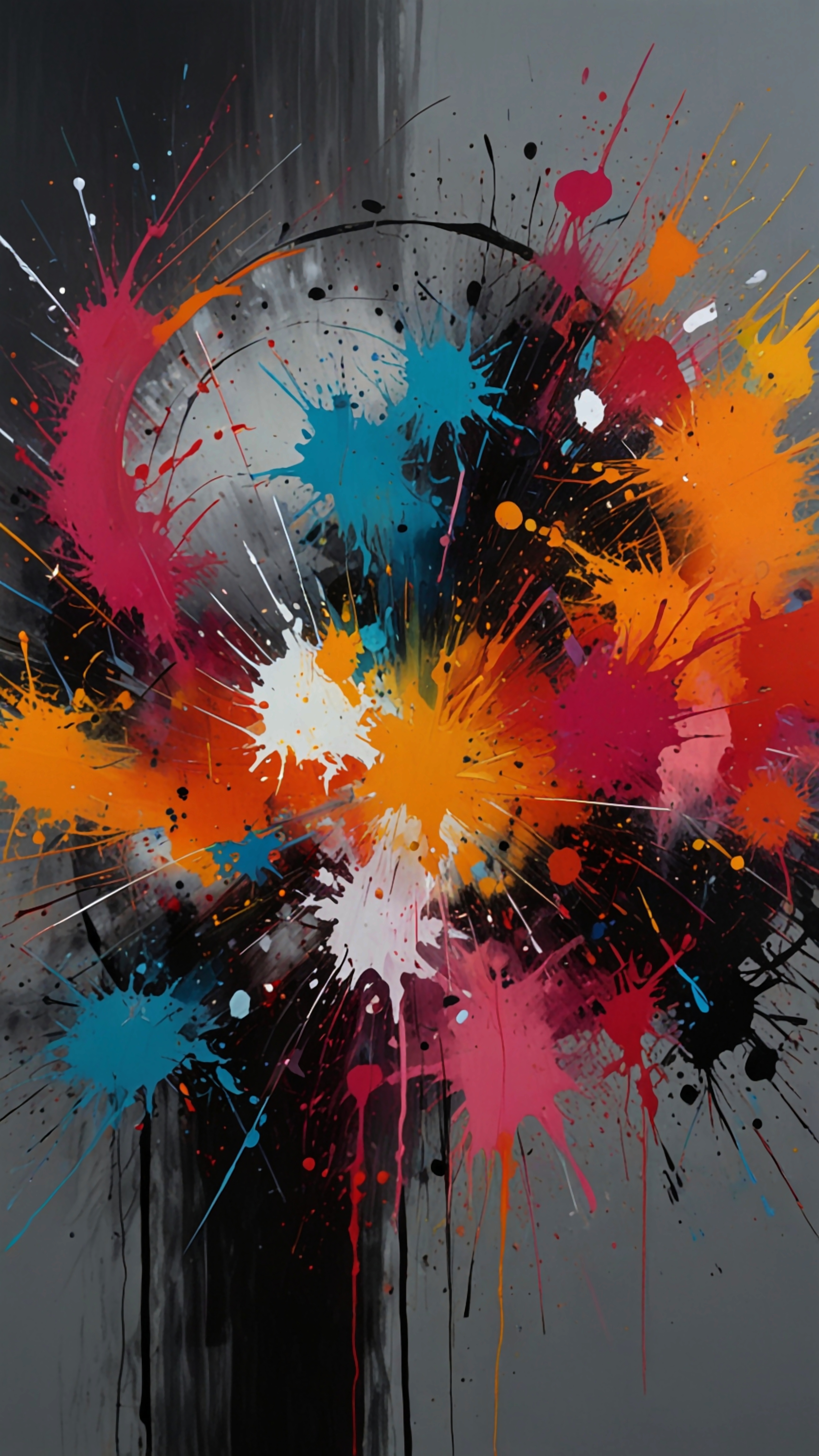Immerse yourself in a vibrant burst of color with this dynamic splatter art wallpaper. Bold strokes of pink, orange, and blue collide against a modern gray backdrop, injecting energy and creativity into your space.