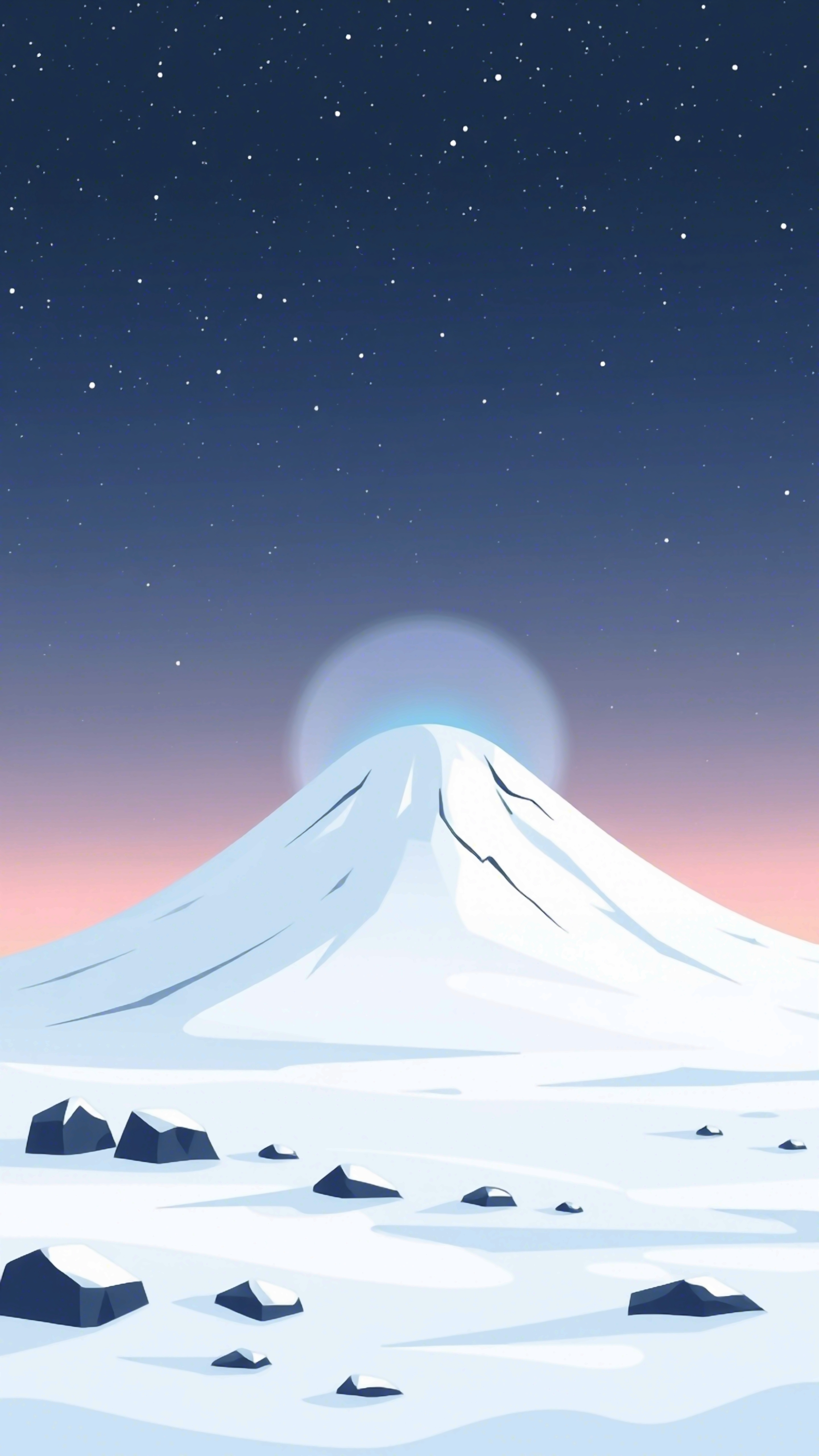 Gaze upon a serene winter scene with a snow-capped mountain rising beneath a twinkling starscape. Soft pastel colors create a calm and peaceful atmosphere, perfect for a tranquil escape.