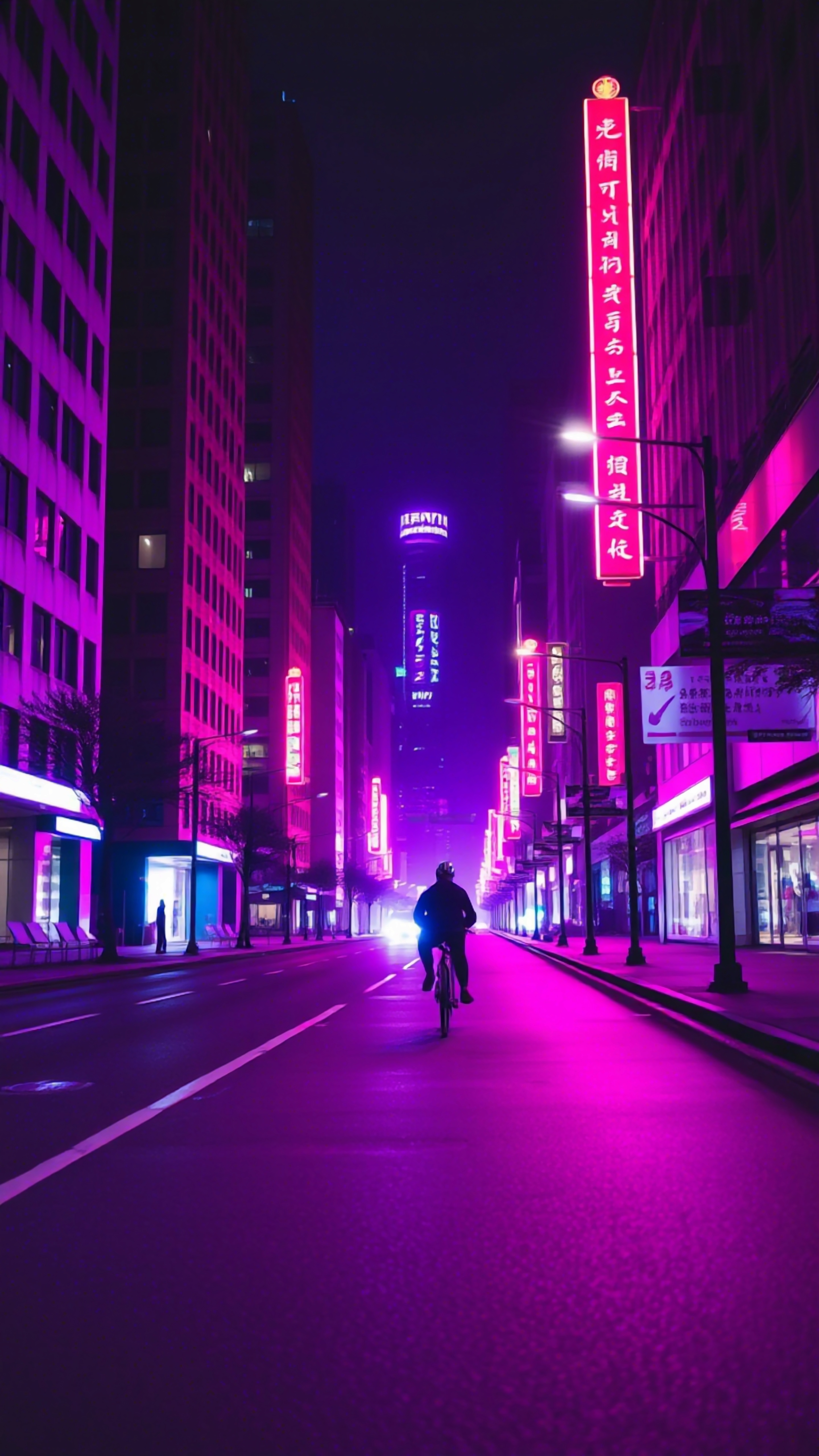 A lone cyclist journeys through a neon-lit city. The cyberpunk street scene glows with vibrant pink and purple hues, offering a sense of adventure and futuristic wonder.