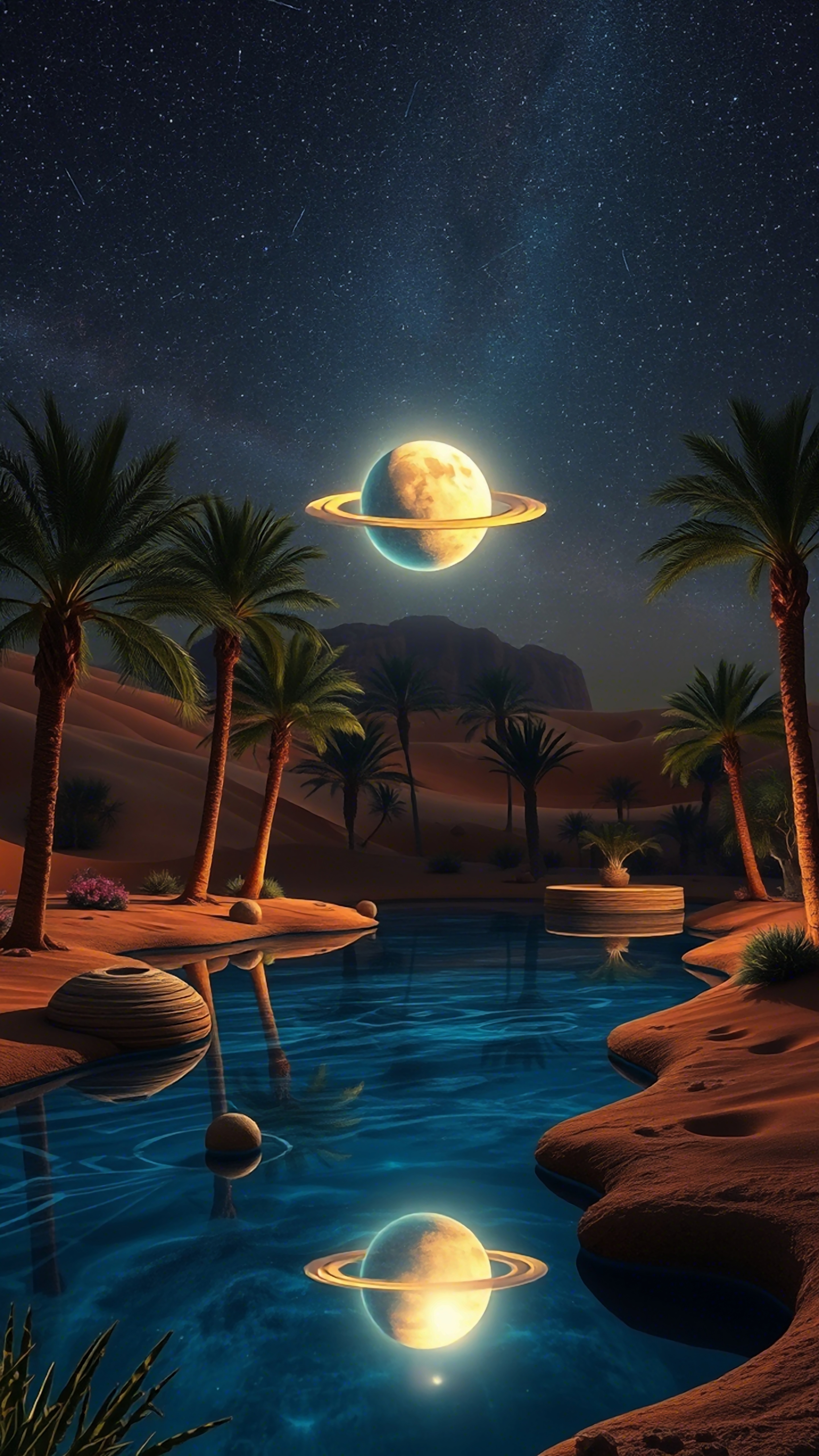 Escape to an otherworldly desert oasis. Palm trees frame a still pool reflecting a ringed planet under a starlit sky, merging terrestrial beauty with cosmic wonder. Feel the magic.