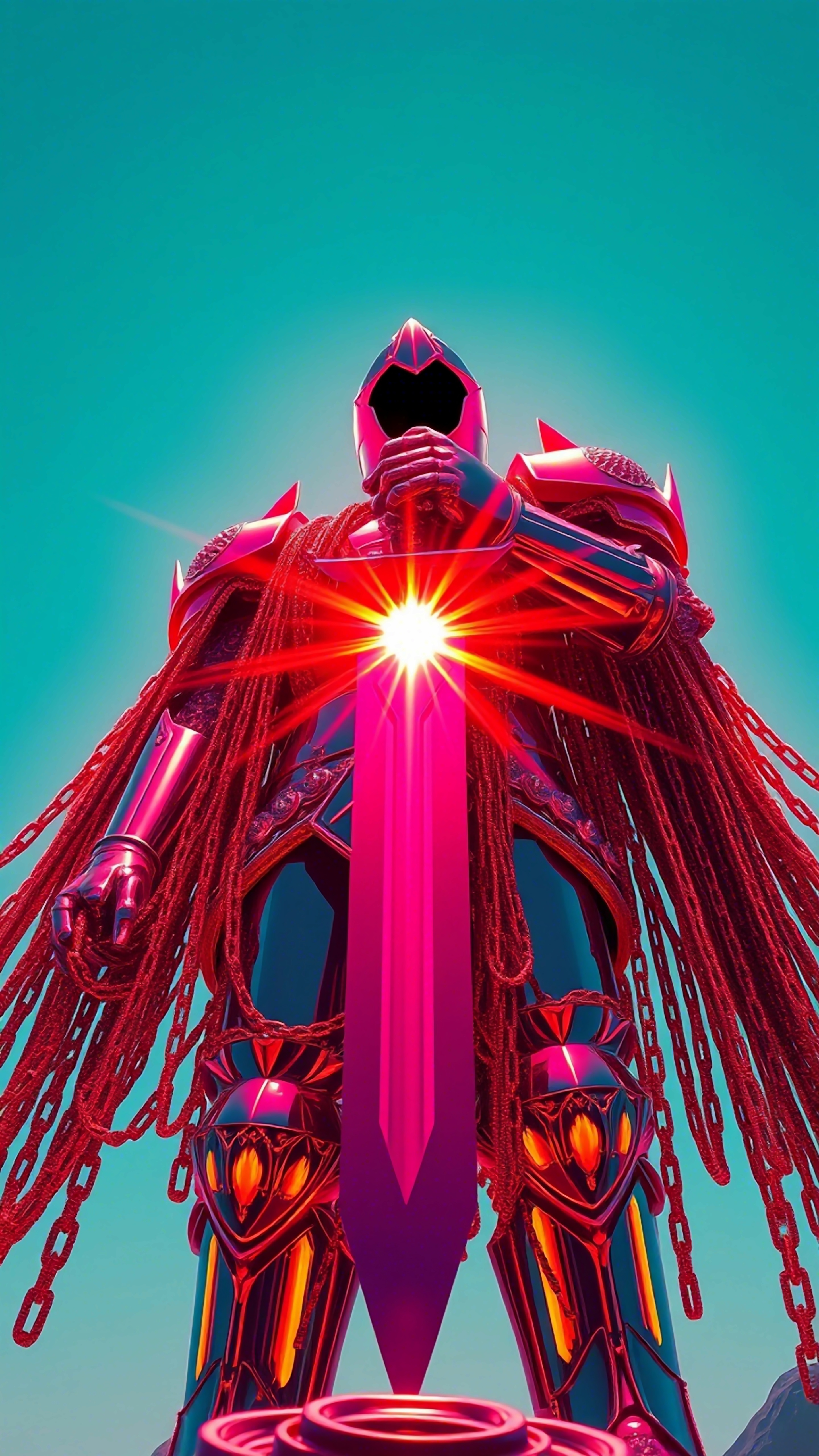 A powerful, gleaming knight in crimson armor stands ready with a radiant sword against a teal sky. This striking image evokes strength and fantasy, perfect for a bold, dynamic wallpaper.