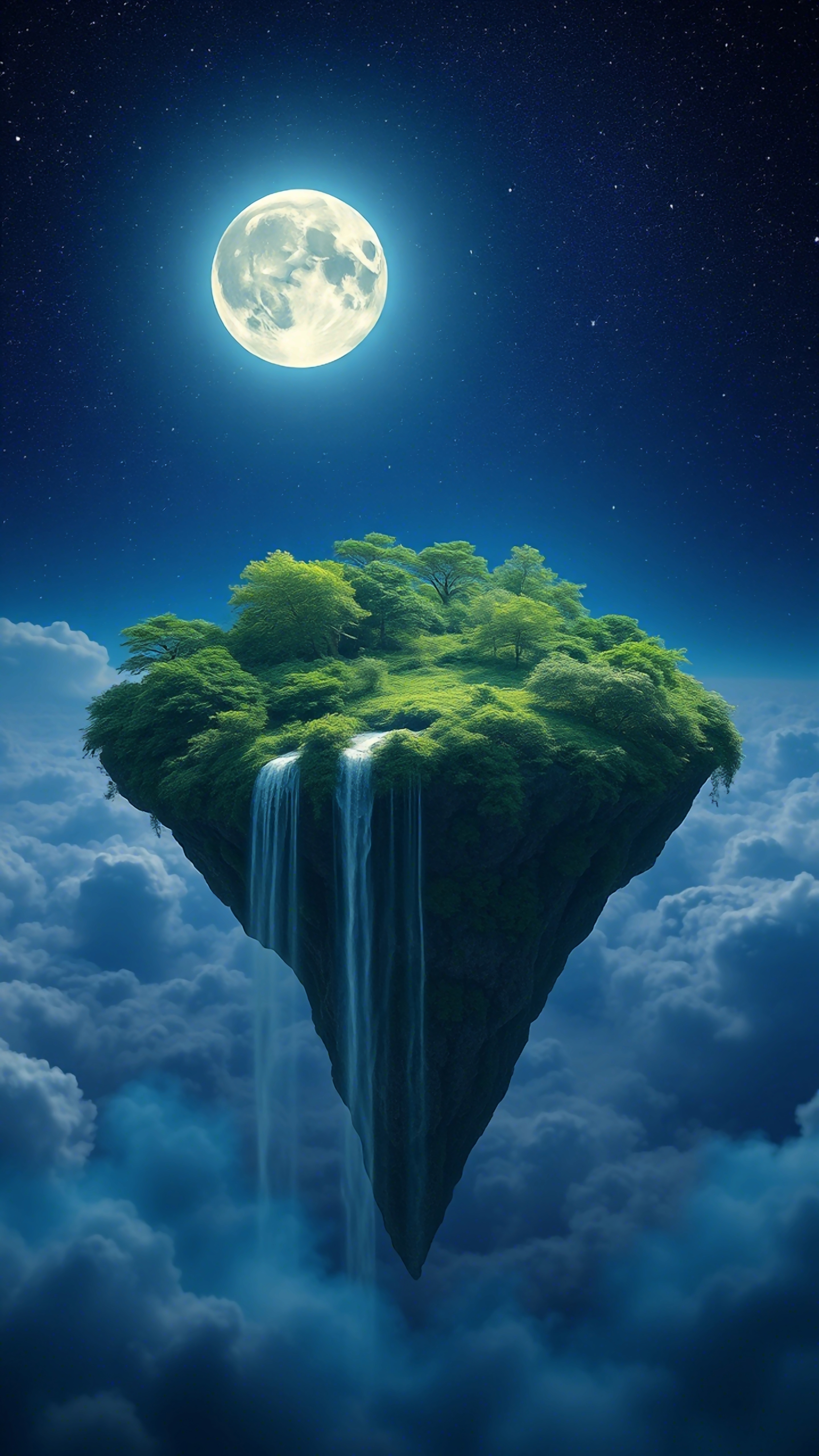 Escape to a dreamy realm with this stunning wallpaper. A lush island floats serenely above clouds under a radiant moon, promising peace and wonder. Perfect for adding a touch of fantasy to your screen.
