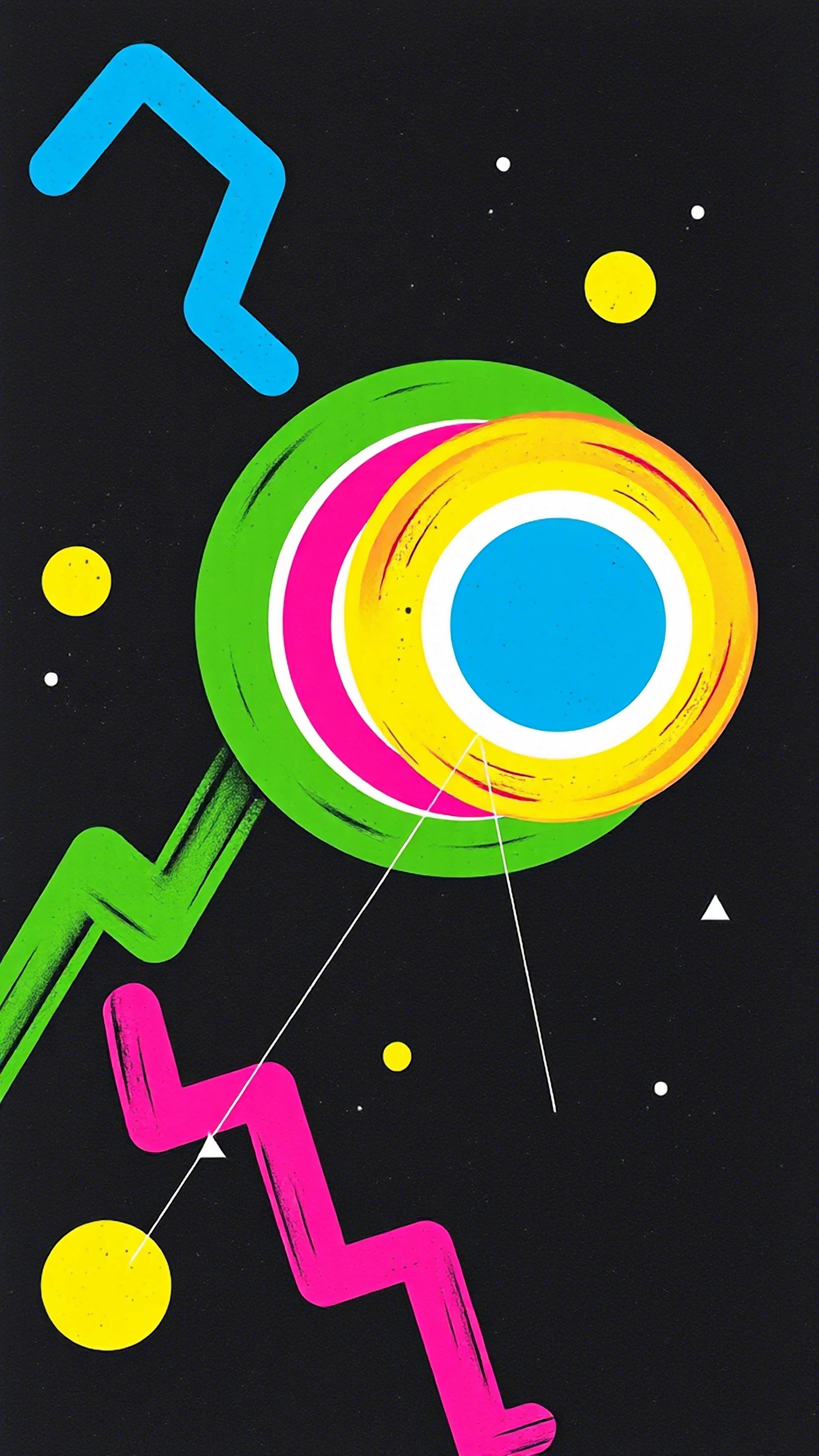 Immerse yourself in a vibrant, retro world with this 80s-inspired abstract design. Bold shapes and vivid colors pop against a stark background, creating an energetic and playful mood.