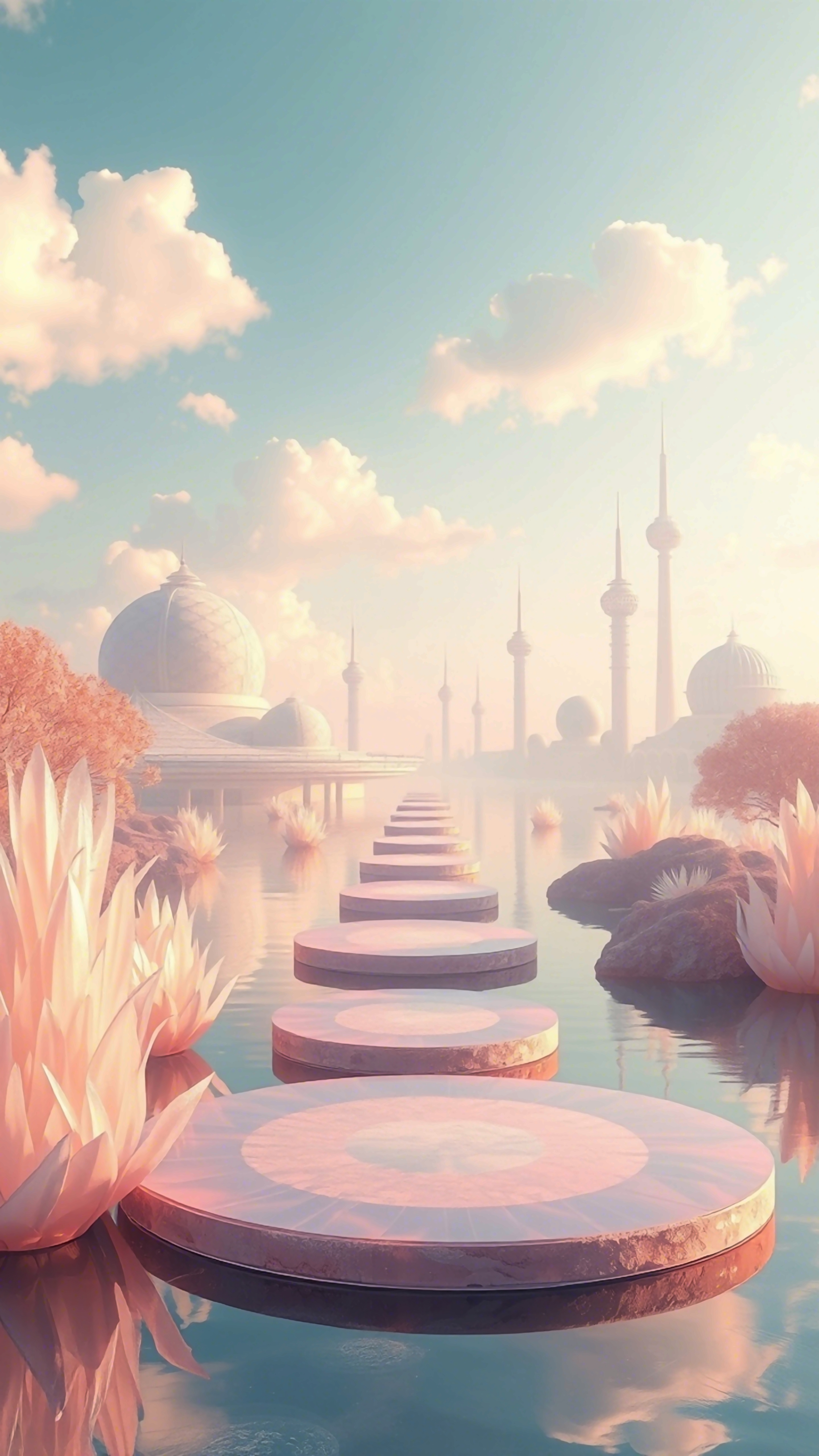 Escape to a serene, pastel paradise. This dreamy wallpaper features a tranquil water path leading to a futuristic cityscape, bathed in soft pinks and blues. Let its calm beauty transform your screen.