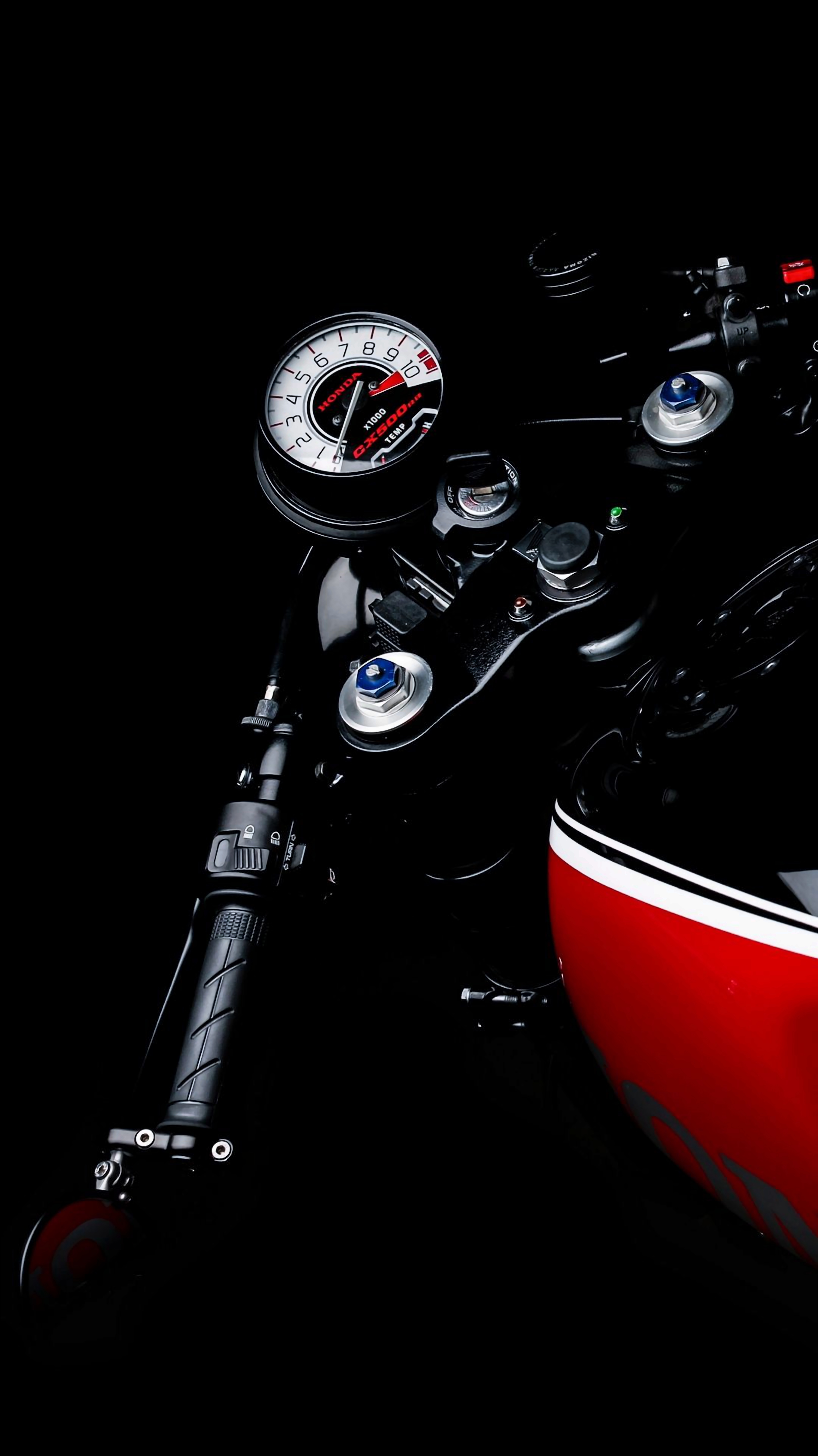 Moody and mysterious motorcycle wallpaper featuring a close-up of the dashboard in deep shadow. The red accents and speedometer hint at speed and adventure. Perfect for motorcycle enthusiasts.