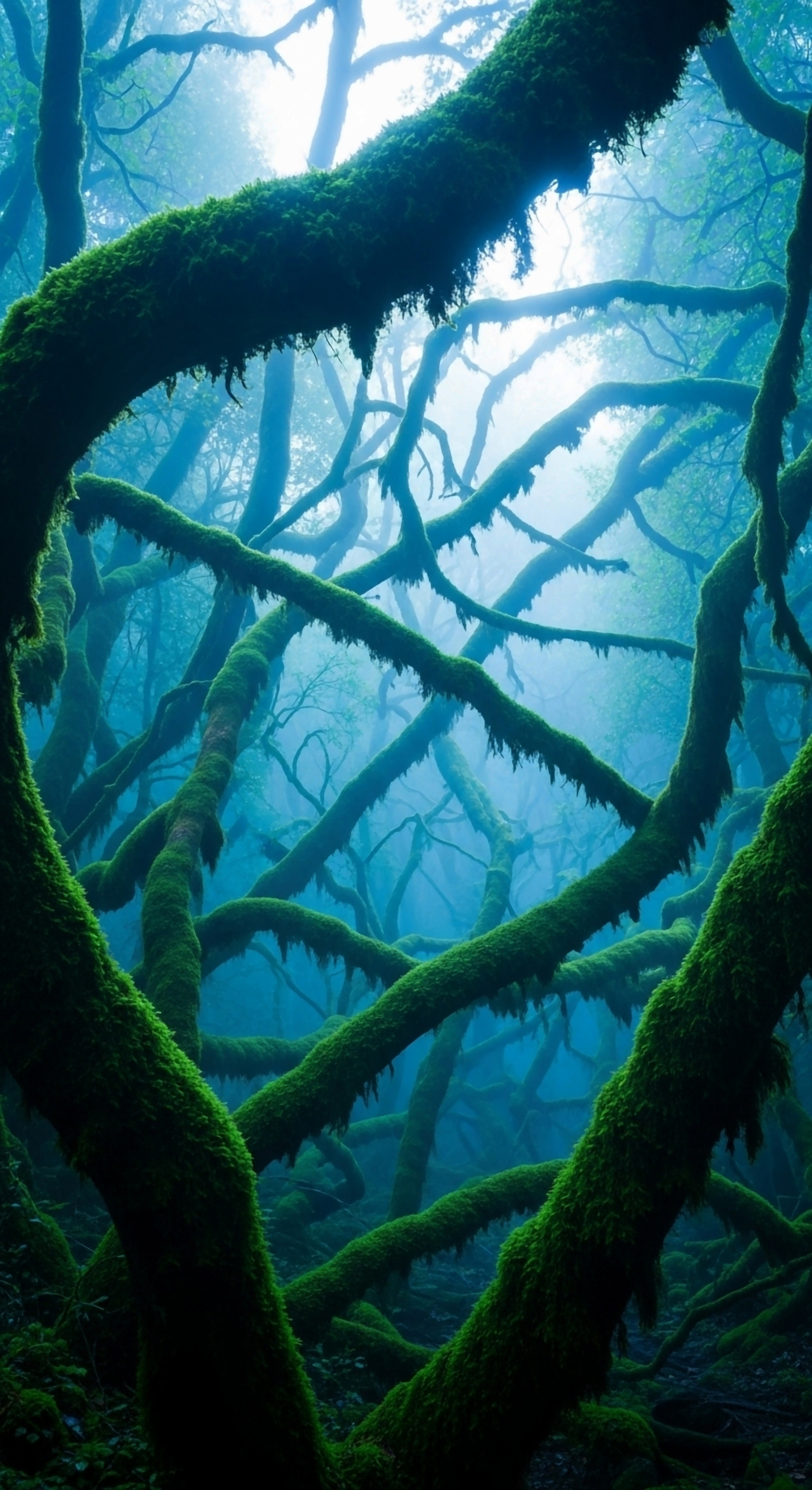 Immerse yourself in this tranquil forest scene, where vibrant green moss covers twisting branches bathed in a soft, ethereal light. Perfect for bringing a touch of nature's serenity to your screen.